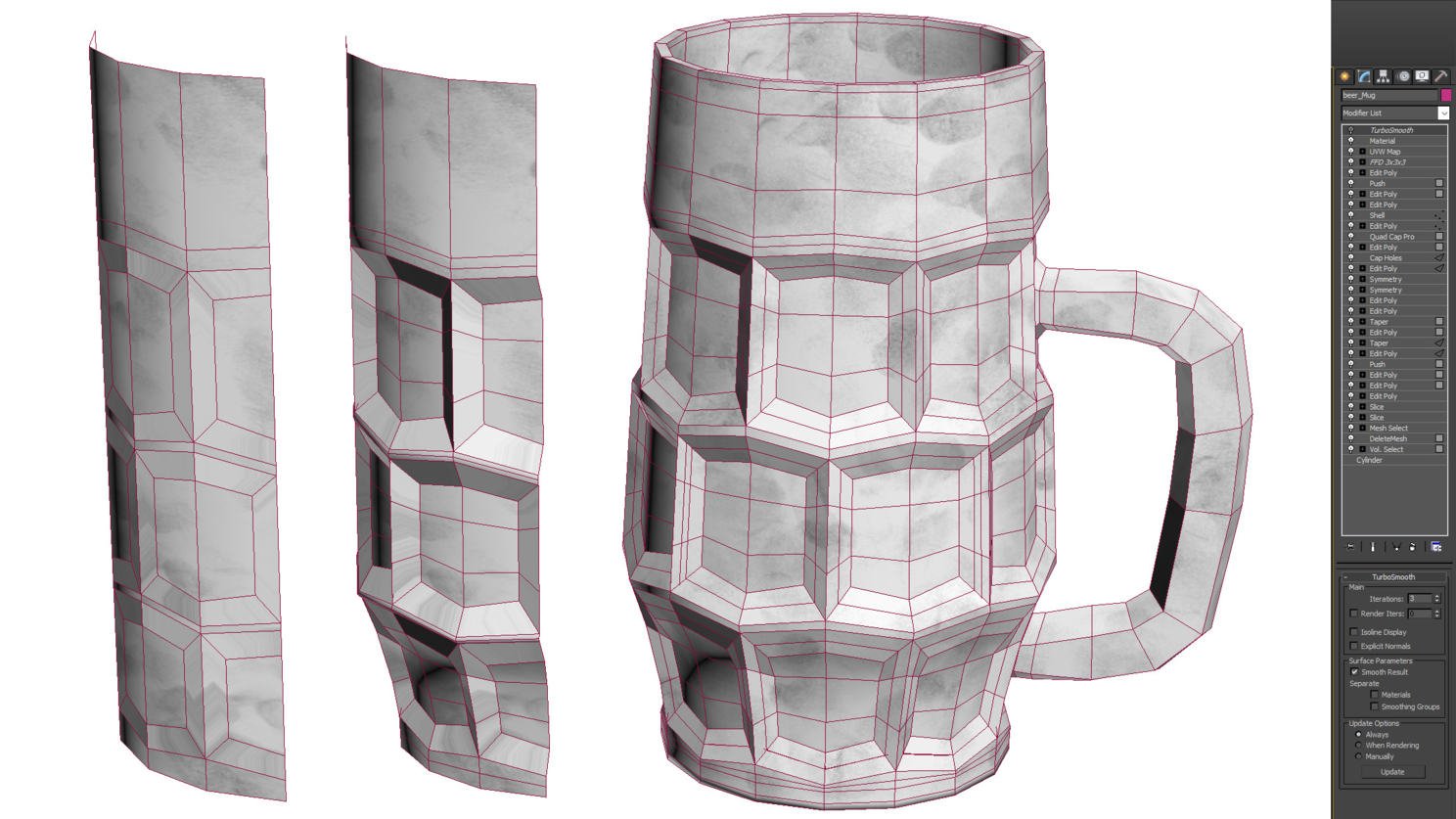 Про моделлинг тут говорить особо нечего, он грубый, лишь бы похоже было. Все выдавлено с четвертинки цилиндра, однако здесь, как и всегда я старался использовать неразрушающие стек процедурные модификаторы (taper, shell, push, FFD и т.д.), чтобы всегда можно было вернуться назад, сделать правки и не получить по итогу взорванный стакан.