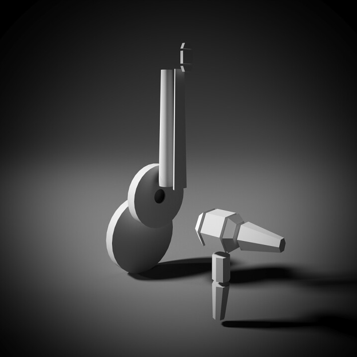 Теперь давайте попробуем разложить реальные предметы на примитивы. Ниже на левом изображении вы видите группу предметов, смоделированных в упрощённом виде, для простоты понимания. На правом изображении показан пример, как можно разложить гитару и фен на цилиндры, призмы, пирамиды и прочие примитивы.