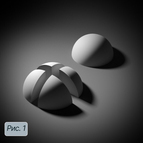 Я рекомендую в повседневной жизни делать такое упражнение: раскладывать на примитивы разные предметы, которые вы видите вокруг. Начните с простого, например, с предметов быта, постепенно усложняя себе задачу, и со временем вы сможете разложить любой объект. На рис.1 изображена усечённая сфера, разделённая на доли. При этом на каждой доле светотеневой рисунок соответствует той части сферы, как если бы она и не была разделена на отдельные элементы.