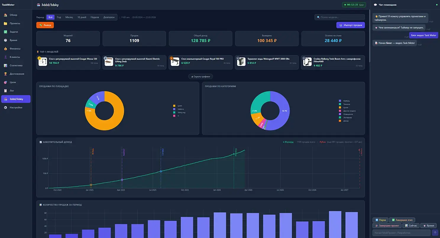 Заходишь на 3ddd.ru/user/income_new, сохраняешь страницу как MHTML (Ctrl+S → «Веб-страница одним файлом»), загружаешь в приложение. И получаешь таблицу по всем моделям: выручка за выбранный период, количество продаж, /ч — доходность к часам, потраченным на создание. Последний показатель — самый честный. Модель может продаваться, но если на неё ушло 40 часов, а за год она дала 600 рублей — это видно сразу, без таблиц в Excel.
