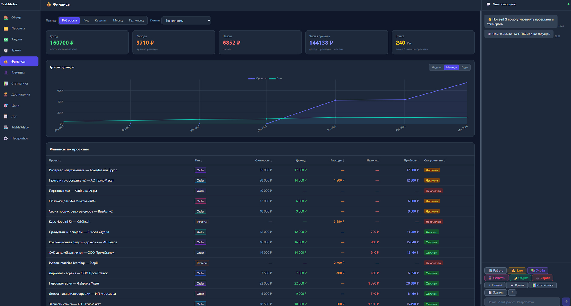 Ссылки в конце. Там же — демо-база данных (fake_db-3.db) с выдуманными проектами, клиентами и историей продаж (в ней даже выплаты от стока превысили продажи 😄). Все персонажи, цифры и названия вымышлены — любое совпадение с реальностью случайно 😄. Когда захочешь начать с чистого листа: просто удали файл fake_db-3.db из папки приложения (предварительно закрыв в трее приложение) и перезапусти TaskMeter — откроется с пустой базой.