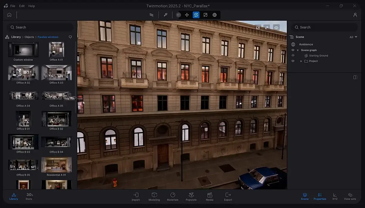 Вы можете конвертировать сетки в Nanite как при импорте, так и после него, включая пакетное конвертирование всех сеток, связанных с объектом. Вы также можете конвертировать в Nanite 3D-ресурсы Megascans и 3D-растения, а также ресурсы Sketchfab. Есть проект, который кажется слишком тяжёлым и медленным? Попробуйте Nanite и почувствуйте разницу. Визуализация экономит время. Кто не любит более быстрый и простой способ изображения чего-либо, когда он выполняет работу так же хорошо, как и сложный путь, и при этом минимизирует влияние на производительность? Две новые функции в выпуске четко попадают в эту категорию. Во-первых, появилась новая поддержка окон параллакса . Если вы визуализируете внешний вид здания, моделирование того, что может находиться внутри окон для дополнительного реализма, может быть утомительной рутиной. Окна параллакса используют шейдер Open Shading Language (OSL) для создания иллюзии внутренней глубины на простой легкой плоскости, имитируя комнаты или интерьеры зданий без необходимости сложной трехмерной геометрии. Вам даже не нужно моделировать оконные проемы — просто поместите окно параллакса на внешнюю поверхность. В выпуск включили папку окон параллакса с 27 различными интерьерами в библиотеку, охватывающую темы офисов, жилых домов, спортзалов и магазинов, а также пользовательское окно, которое позволяет вам добавлять собственные карты из таких источников, как wParallax и Evermotion . Функция включает в себя возможность имитировать стеклянное покрытие, а также ночное освещение с анимированной случайной выборкой.