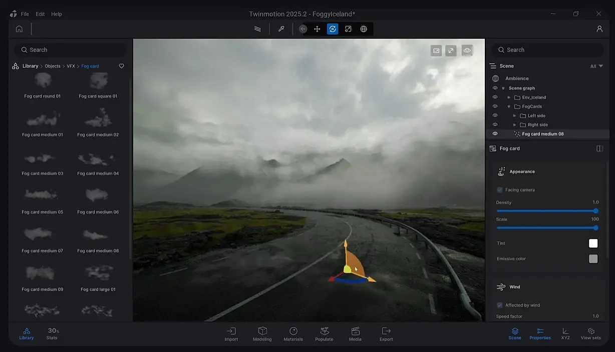 В этом выпуске представлен ещё один простой способ добавить реализма в вашу сцену. Благодаря 17 новым анимированным картам тумана, входящим в папку VFX библиотеки, вы можете легко размещать туман простым перетаскиванием, практически не влияя на производительность. Туман может реагировать либо на ветер сцены, либо на скорость и направление ветра, заданные специально для каждой карты тумана.