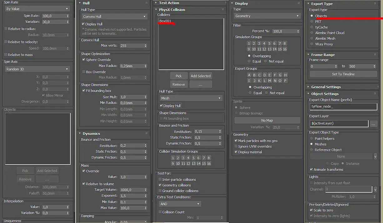 После того как прошла анимация, нам остается выбрать нужный фрейм с тем результатом, который нас устроит. И переходим в настройки последней ноды, для того что бы экспортировать симуляцию из системы частиц в геометрию. Настраиваем как на скриншоте и нажимаем кнопку Export Particles as Objects.