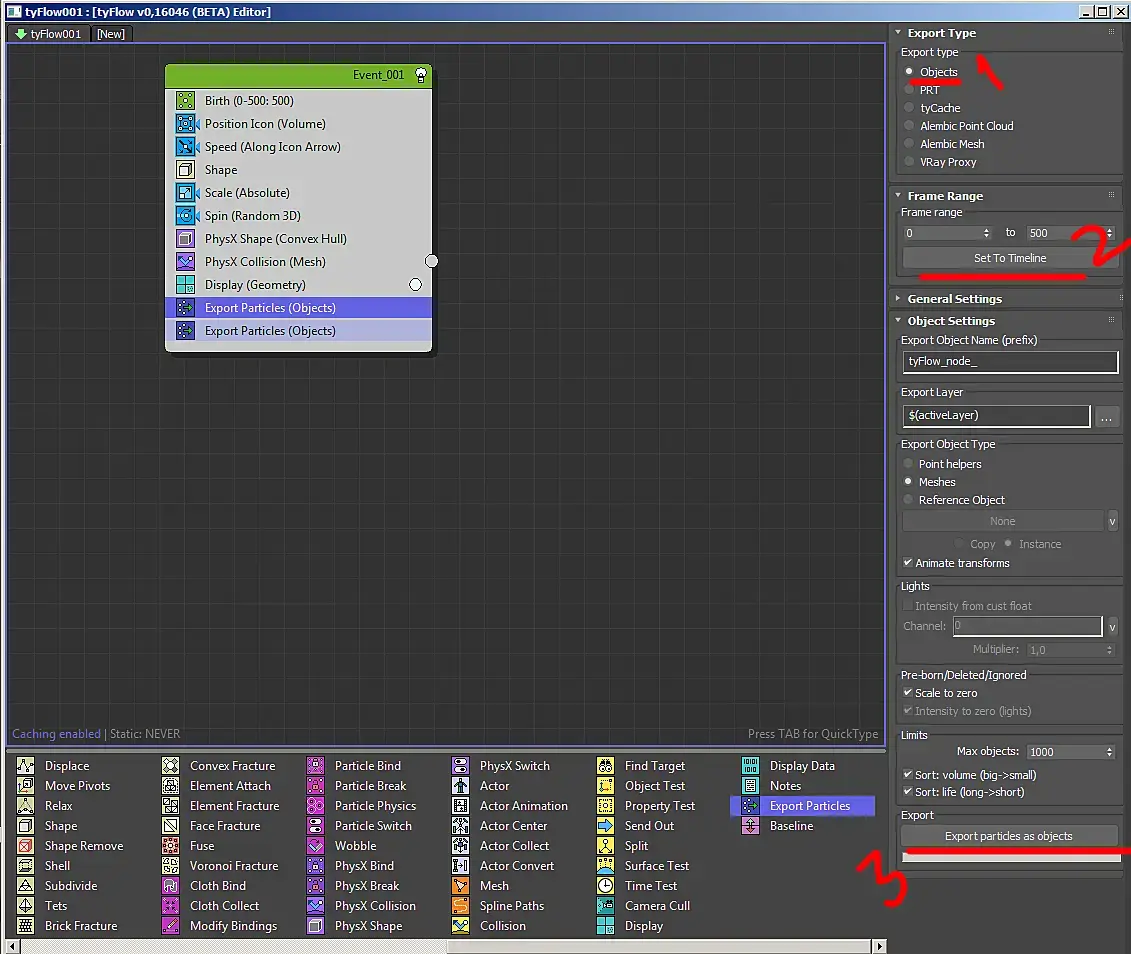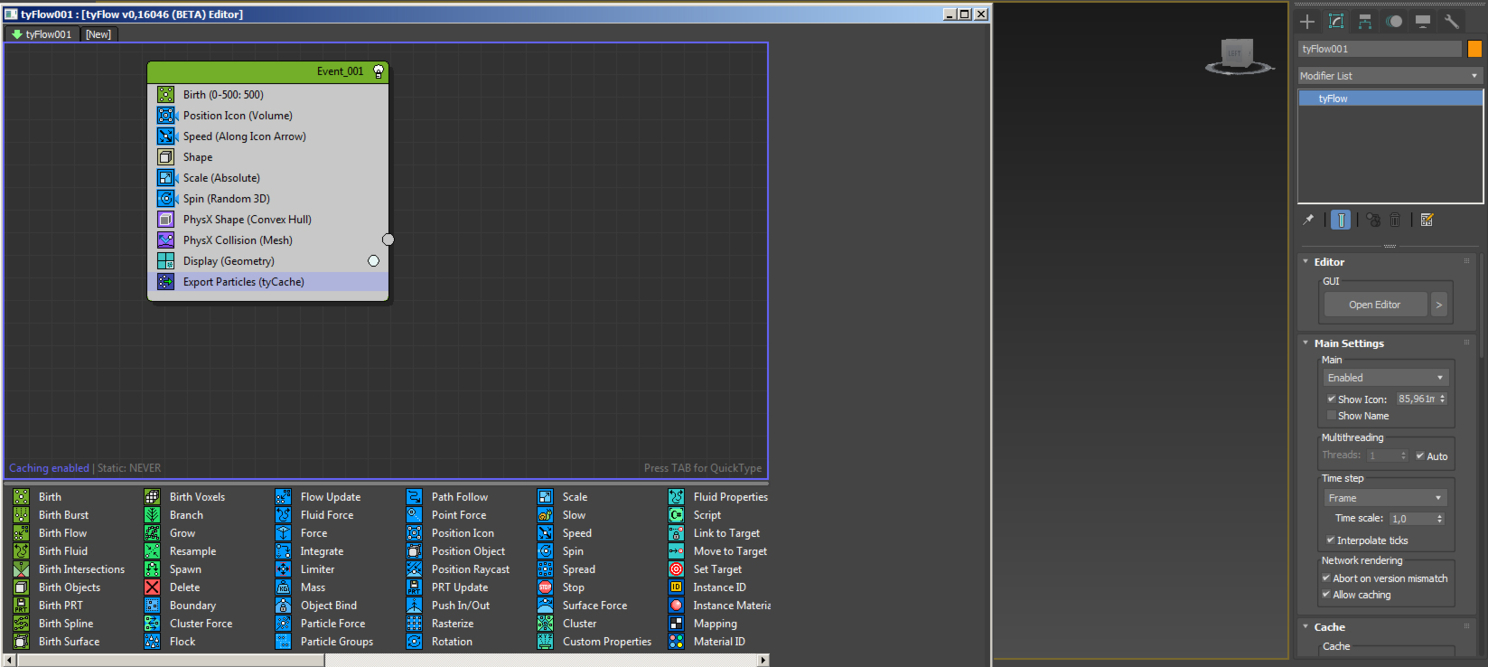 После выбираем наш tyflow и открываем editor и перед нами открывается нодовое окно настройки частиц. Выбираем нужные: