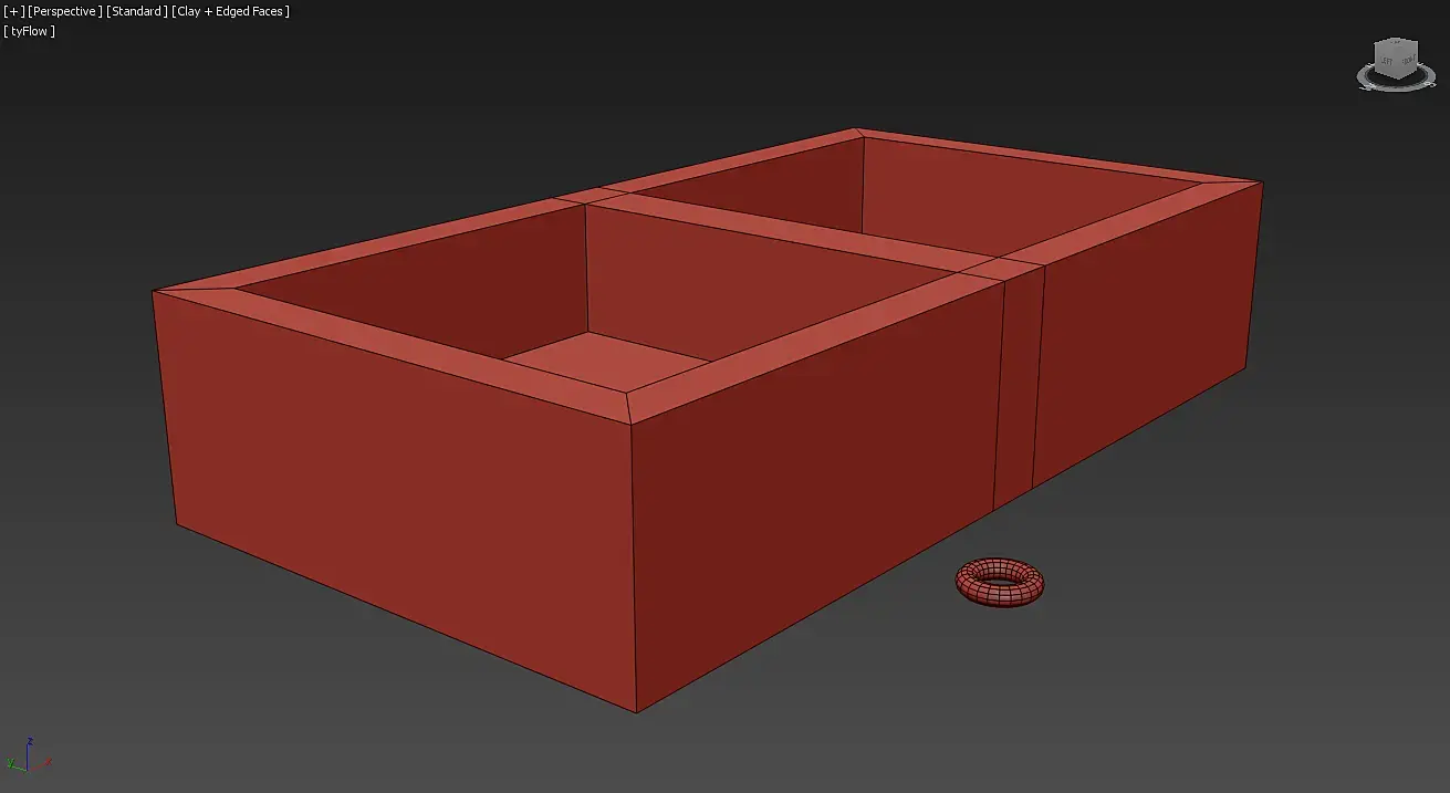 Приступаем к работе. Для создание симуляции я взял модель емкости, обычный бокс разделенный брайджем на две секции. И примитив "торус", который послужит нам заменой частицы и послужит наполнителем.