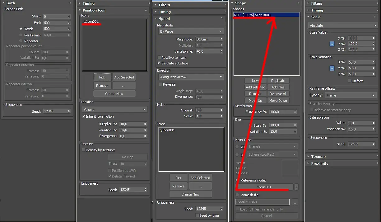 Мы будем использовать 10 нод для нашего урока. Birtch(Нода продолжительности жизни наших частиц), Position Icon(Нода подключения нашей иконки направления),Speed(Нода движения),Shape(нода формы), Scale(Нода масштабирования),Spin(Нода рандомайзер),PhysX Shape(Нода физической симуляции формы), PhysX Shape(коллизия с твердыми объектами), Display(отображение), Export Particles (экспорт частиц в геометрию).