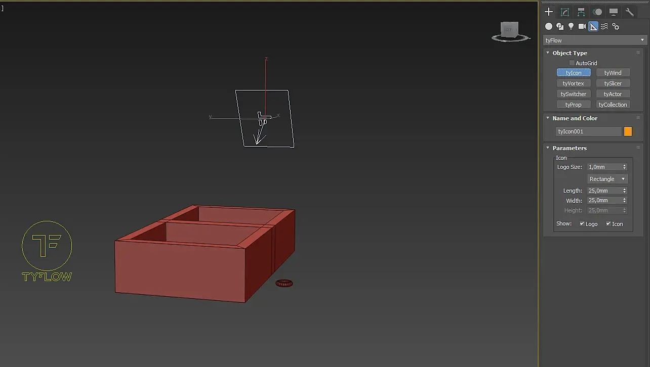 Далее на командной панеле, в стандартных примитивах выбираем tyflow и размещаем рядом с геометрией. Так же нужно зайти во вкладку "Хэлперс" свитка tyflow и выбрать tyIcon и установить так что бы стрелка была направлена на нашу емкость.