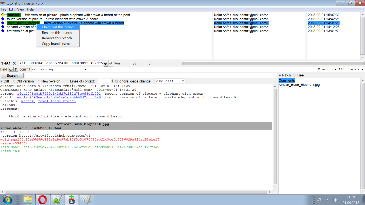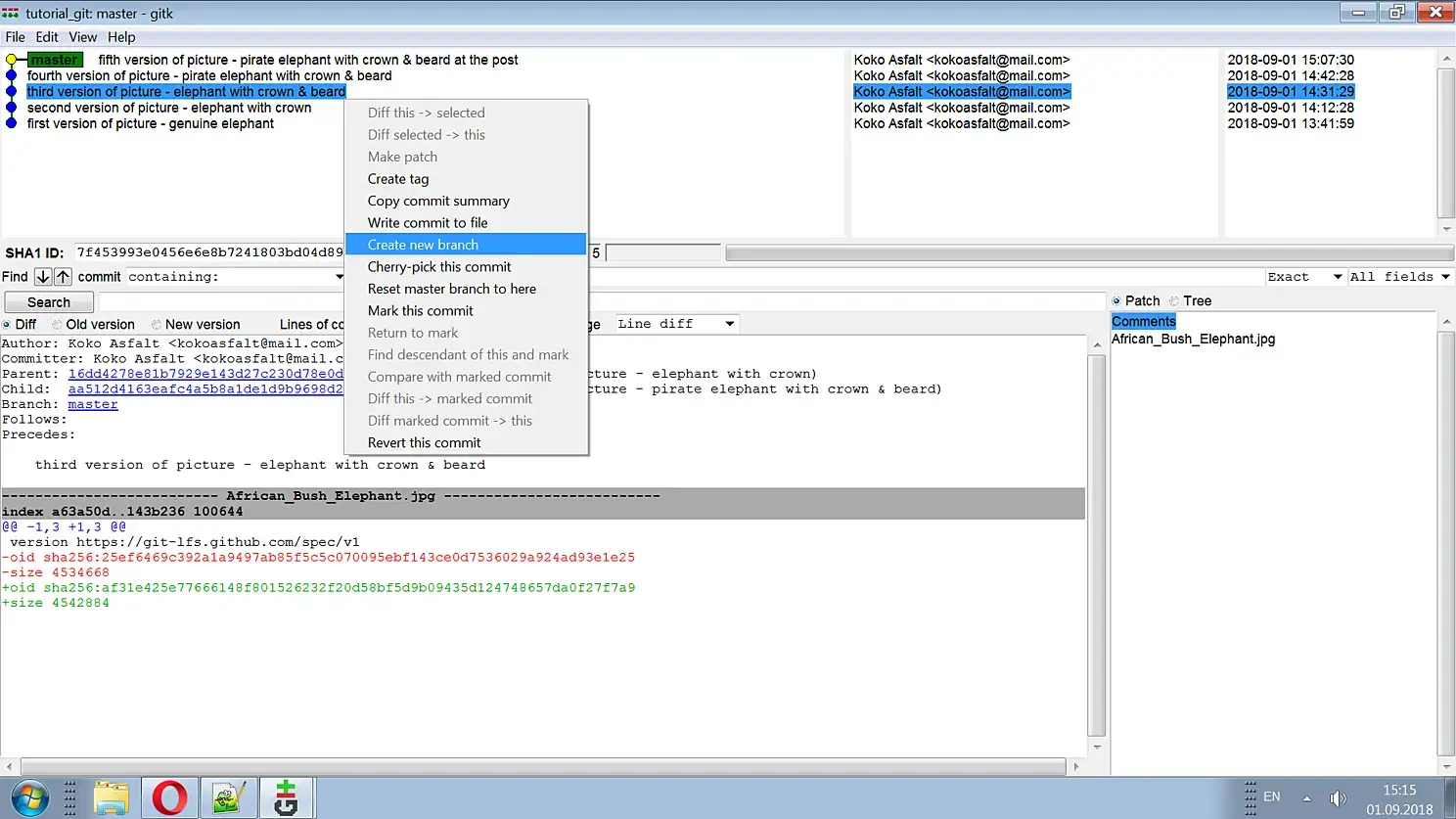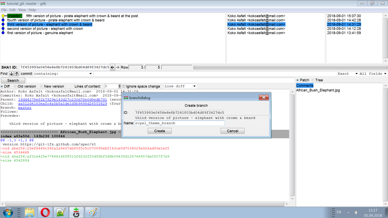 Представим, вы получили указание на смену тематики работы. Надо переделывать картинку, взяв за основу ее третью версию. Чтобы перейти на другое состояние файла, прямо в окне просмотра истории следует щелкнуть правой кнопкой мыши на коммите с описанием «third version of picture…», в появившемся меню будет пункт «Create new branch»