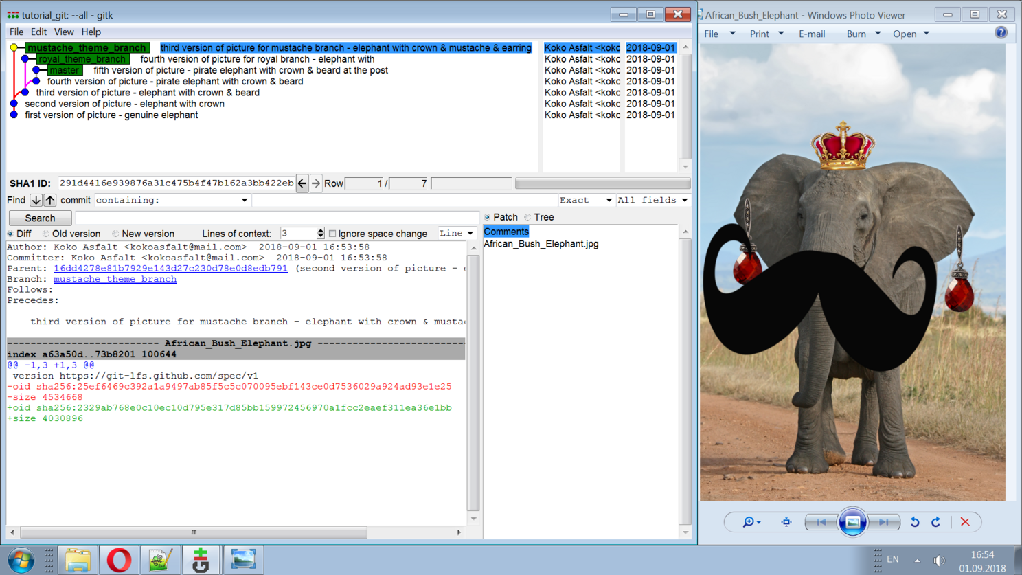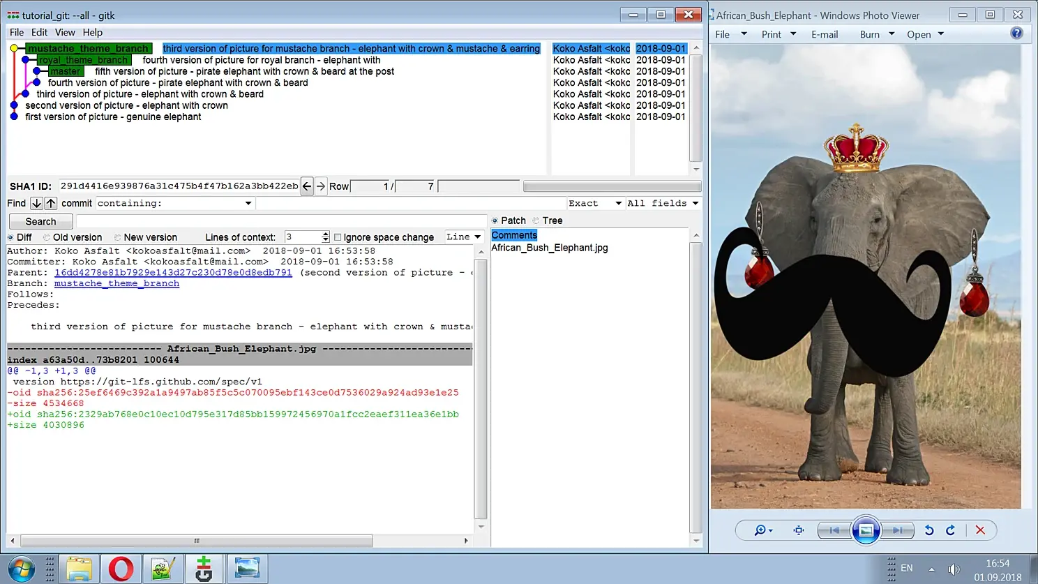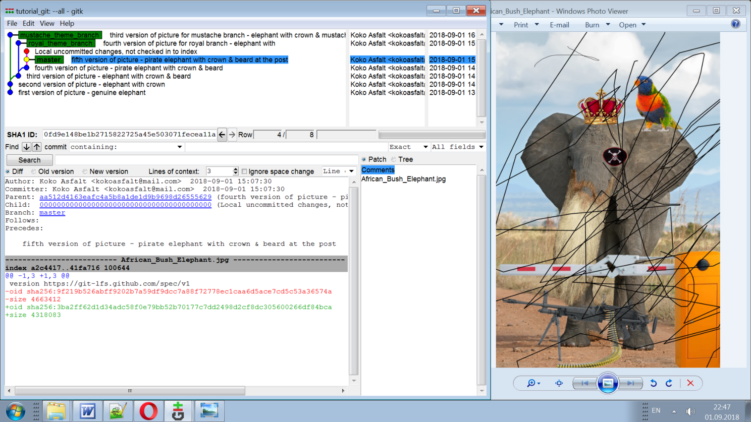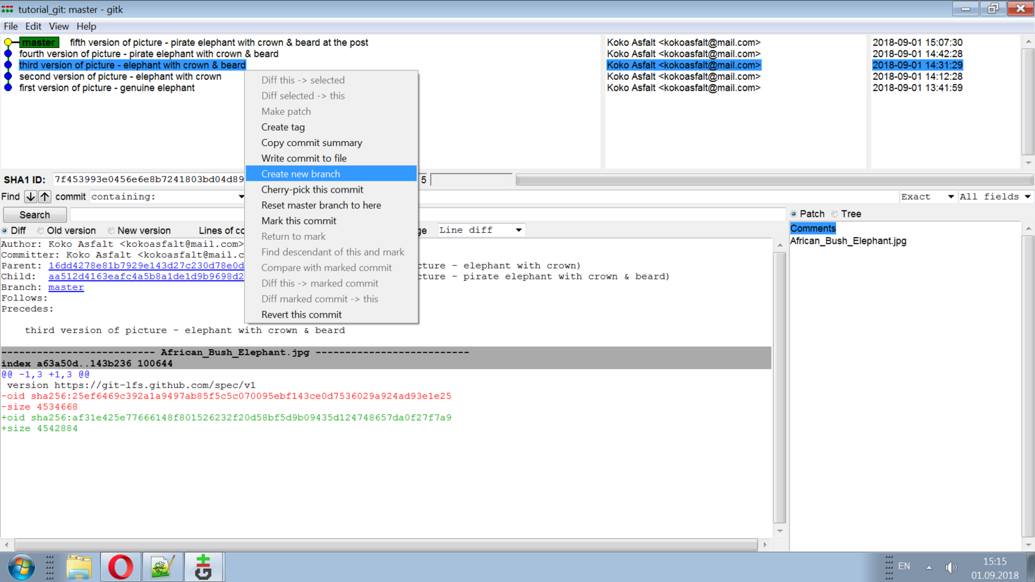 Представим, вы получили указание на смену тематики работы. Надо переделывать картинку, взяв за основу ее третью версию. Чтобы перейти на другое состояние файла, прямо в окне просмотра истории следует щелкнуть правой кнопкой мыши на коммите с описанием «third version of picture…», в появившемся меню будет пункт «Create new branch»