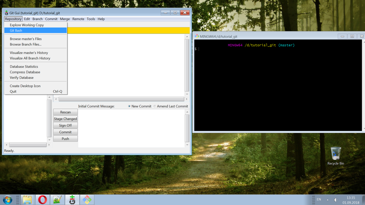 Для учебных целей Git LFS ставить не обязательно, можно проводить абсолютно все действия без расширения, только работа с изображениями получится неэффективной. Те, кто решили его поставить, делают это всего один раз после установки программы. В меню выбрать «Repository – Git Bash». В появившемся окне консоли ввести git lfs install и жать Enter