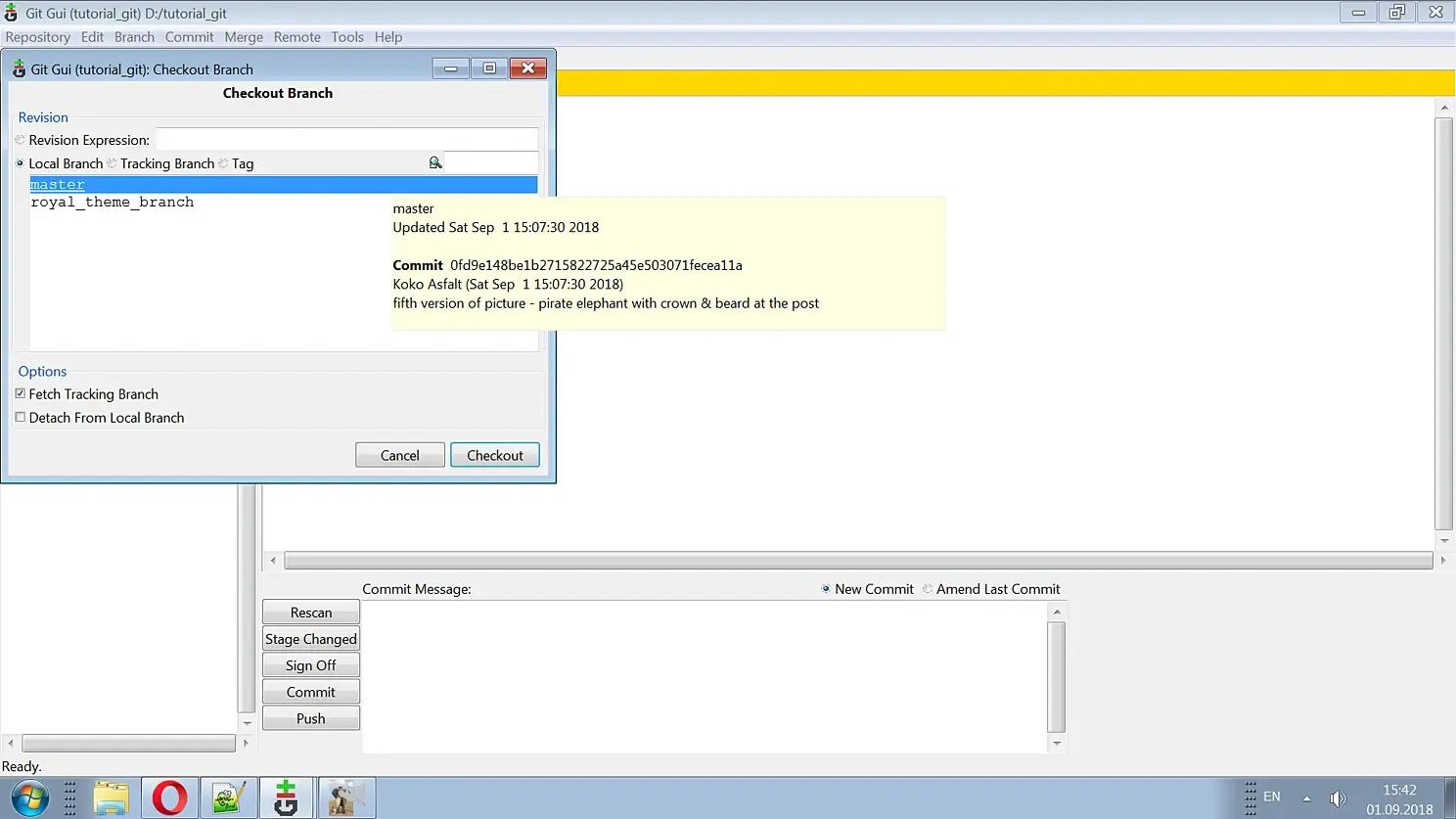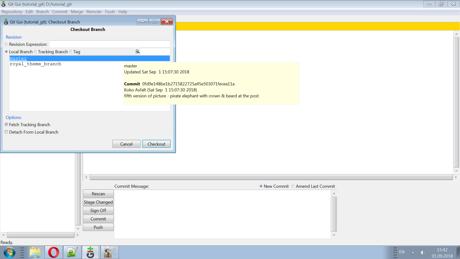 Сейчас лучше видно древовидную структуру проекта, с двумя ветками. Выйдем из истории в основной интерфейс программы. Переключимся на последний коммит из master: для этого надо выбрать пункт меню «Branch – Checkout», в появившемся окне выделяем master и жмем «Checkout»