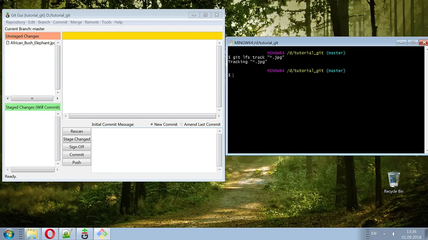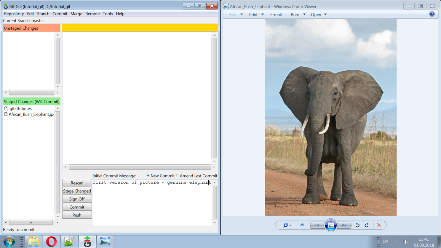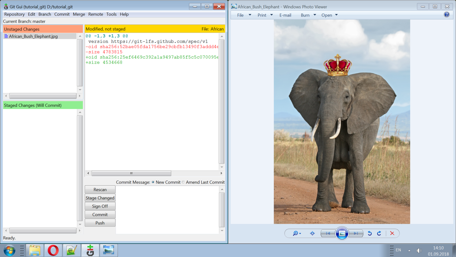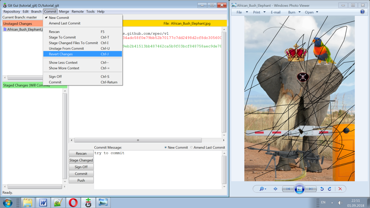 Добавим в папку картинку формата jpg. Как только файл будет перенесен, то в интерфейсе программы его имя появится в списке «Unstaged Changes» (обновление интерфейса программы как в браузере по F5). Чтобы зафиксировать текущее состояние файла в системе контроля версий, надо сделать два шага: