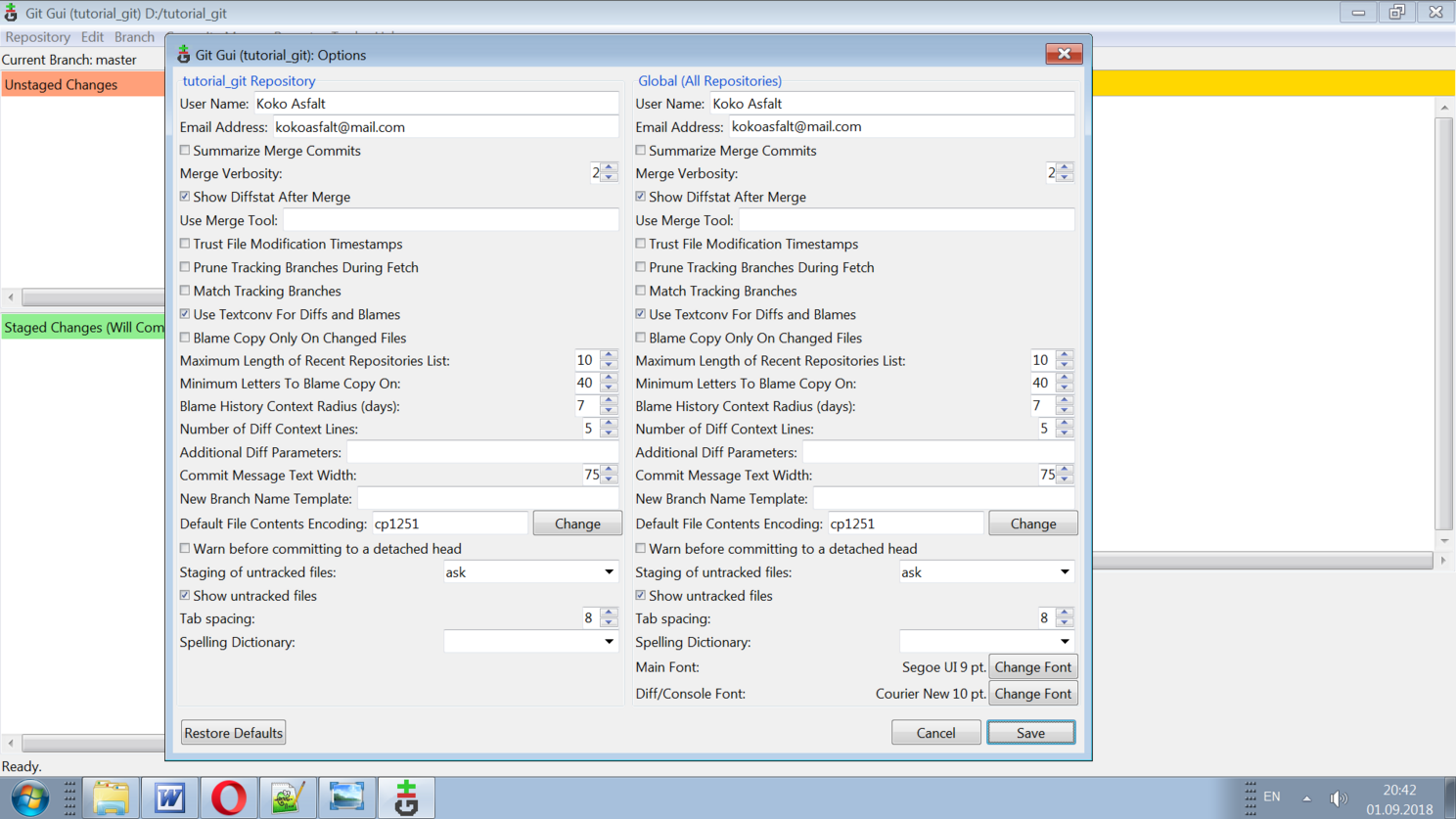 Нужно сделать пару настроек после первого запуска программы. В «Edit – Options» найти по два поля «User Name» и «Email Address». Это глобальные и локальные имя пользователя и почтовый адрес. Можно ввести любую правдоподобную информацию, т.к. в настоящий момент для нас это лишь внутренняя настройка, формально нужная для обозначения инициатора при внесении изменений в системе. Жать «Save».
