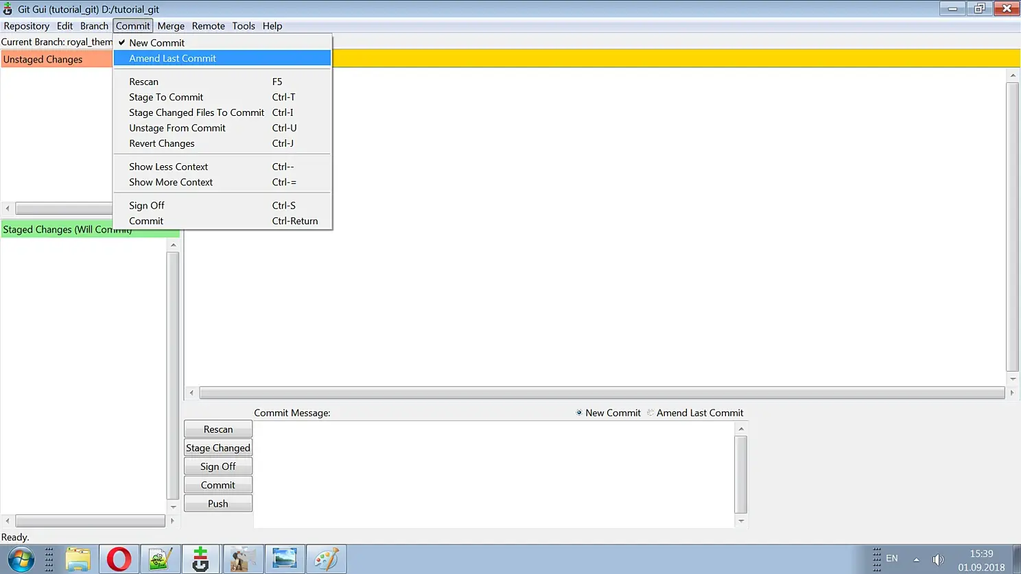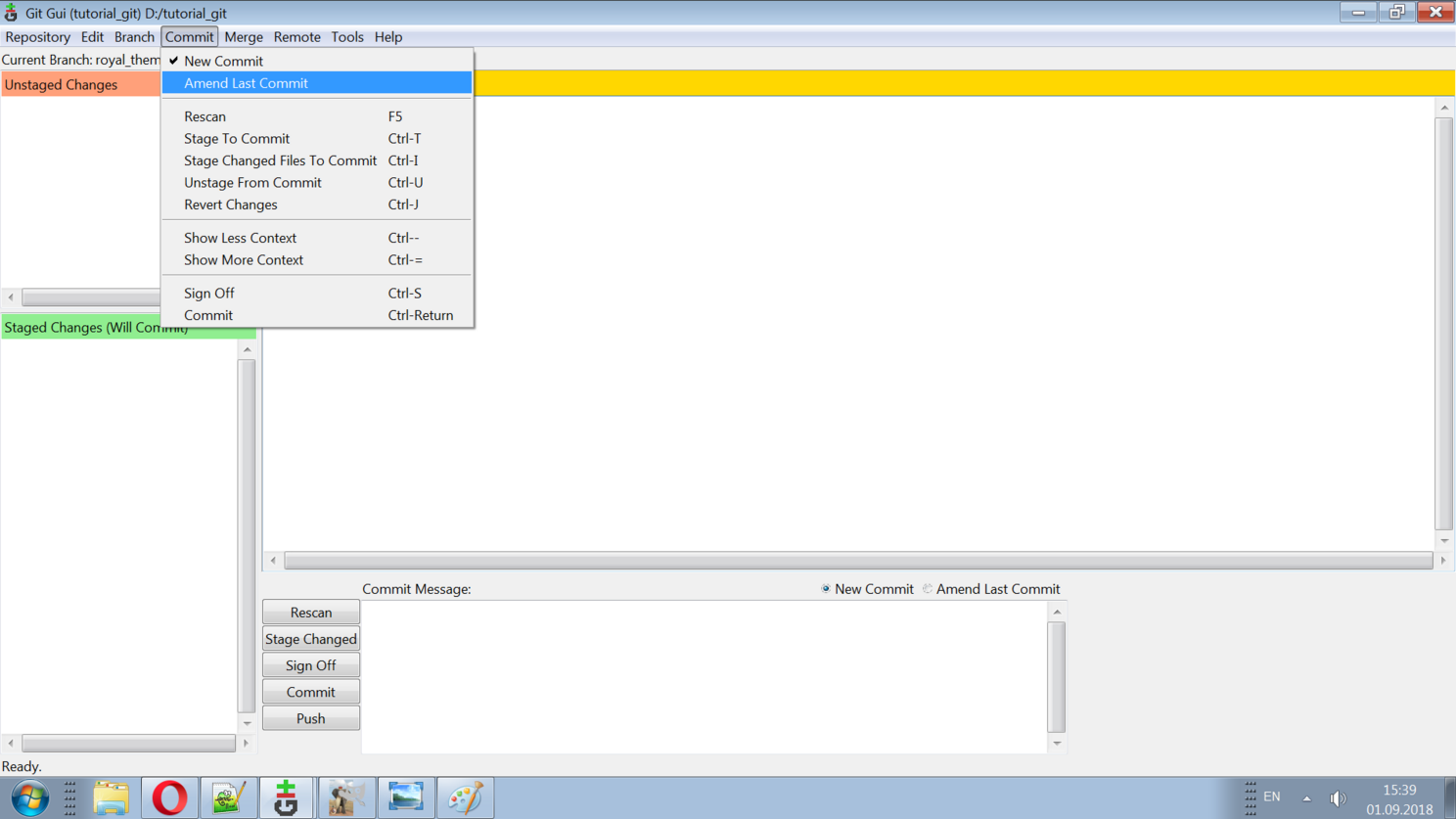 1) Первый шаг - перенести изменения файла из «Unstaged Changes» в «Staged Changes». Делается это с помощью пункта «Stage Changed Files To Commit» из меню «Commit».