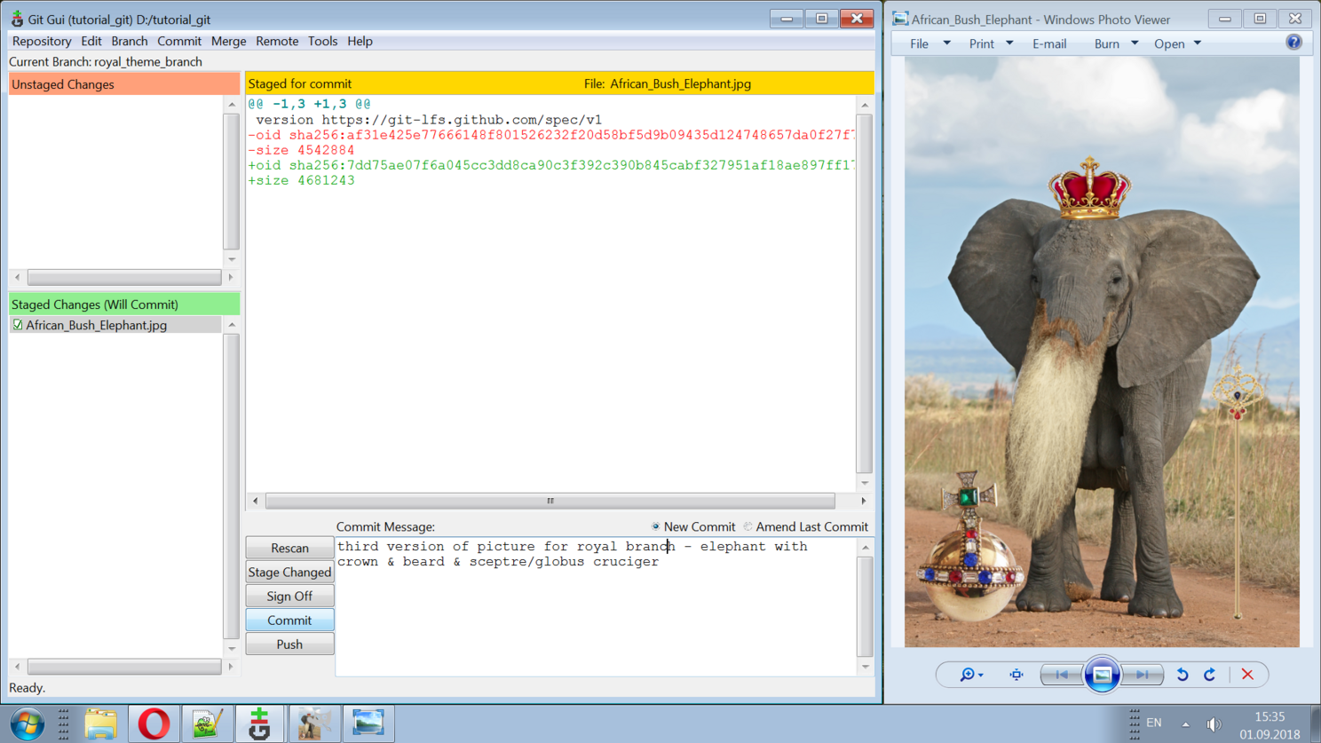 Желтый круг в интерфейсе сменил расположение: это значит, что текущей веткой является royal_theme_branch. Изображение вернулось на третью версию. Делаем доработки для картинки. Вносим изменения в систему контроля версий.