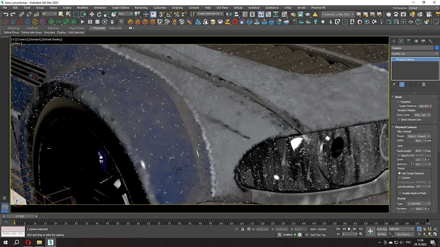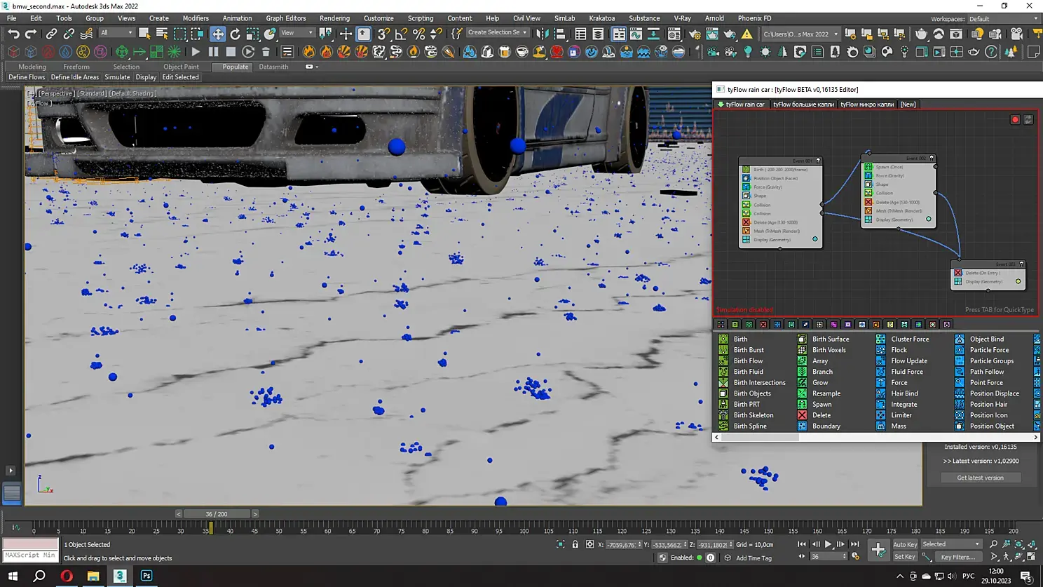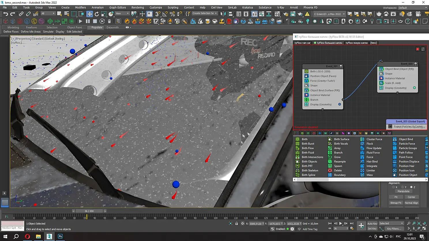 Второй набор капелек - это процедурные Tyflow сферы которые скатывались по кузову вниз, придавая реализма крупным кадрам