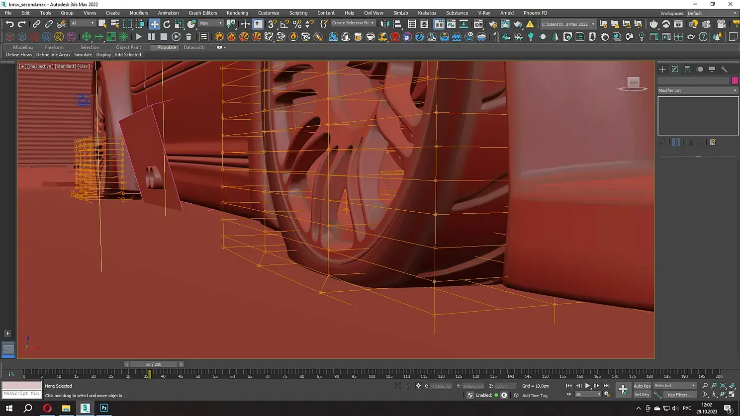 Первые должны были статично "лежать" на кузове, тут ничего сложного, разве что пришлось замоделить шутк 5-6 разных капелек и их через tyflow приклеить к кузову