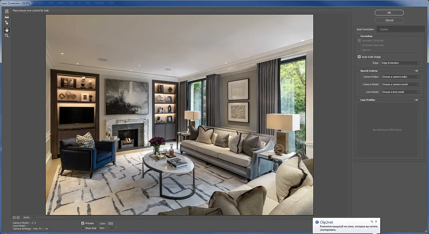 Интерьерную съемку, как правило производят на широкоугольный объектив. Такой тип объективов дает существенные искажения в кадре, как впрочем и другие. Дисторсию можно исправить в фотошопе. Утилита Lens Correction определит тип камеры из EXIF информации снимка. В моем случае ничего не произошло, снимок был глубоко отредактирован, а EXIF информация была потерта.
