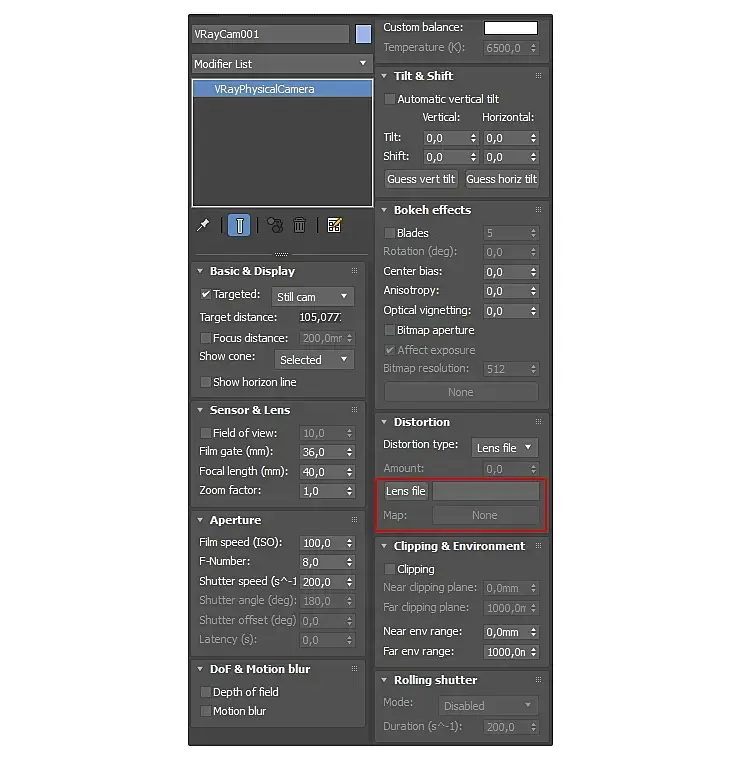 В V-ray есть возможность загрузить линзовый профиль в виртуальную камеру