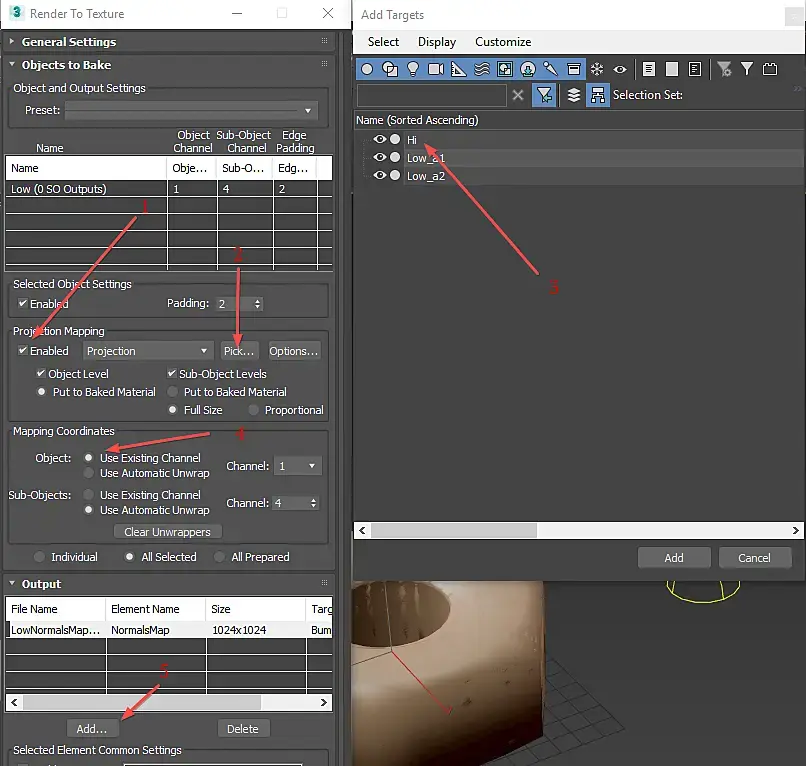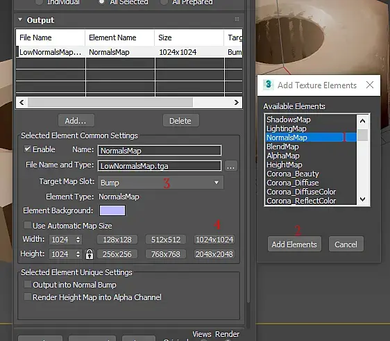 В появившемся окне выберите Normal Map (номер 1 на картинке), затем нажмите Add Elements (номер 2 на картинке) и установите Target Map Slot на Bump (номер 3 на картинке), после чего нажмите на кнопку 1024х1024 (номер 4 на картинке), это позволит вам выбрать разрешение будущей карты. Если размер вам не подходит можно указать его в соответствующем окне немного правее, ограничение - квадрат 8192х8192px.