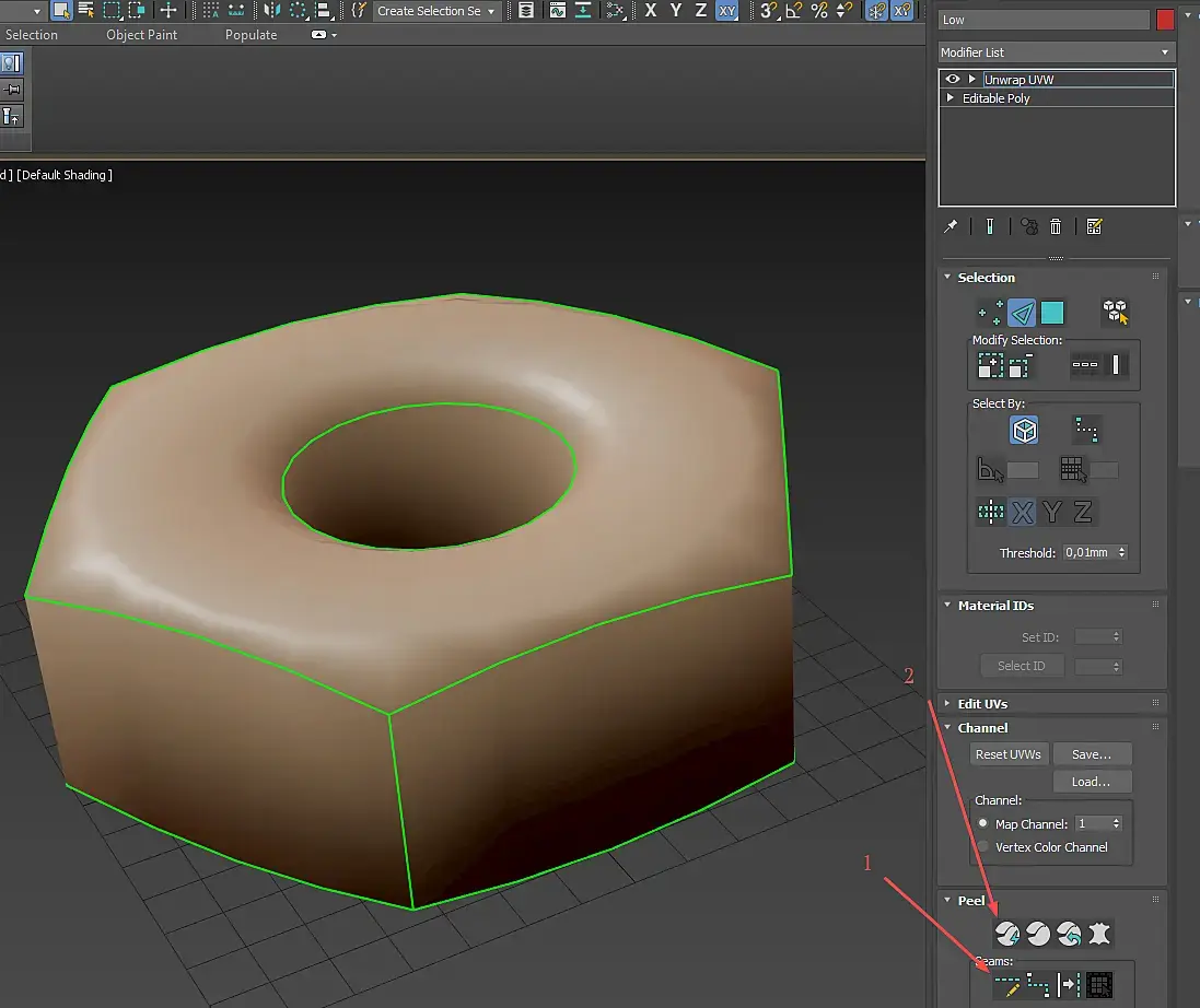 Далее накидываем модификатор Unwrap UVW и выделяем грани которые будут являться швами, после чего нажимаем на кнопку Convert Edge Selection to Seams (Номер 1 на картинке), а затем нажимаем цифру 3 (режим работы с полигонами), Ctrl+A (выделить всё),после чего нажимаем на кнопку Quick Peel (Номер 2 на картинке).