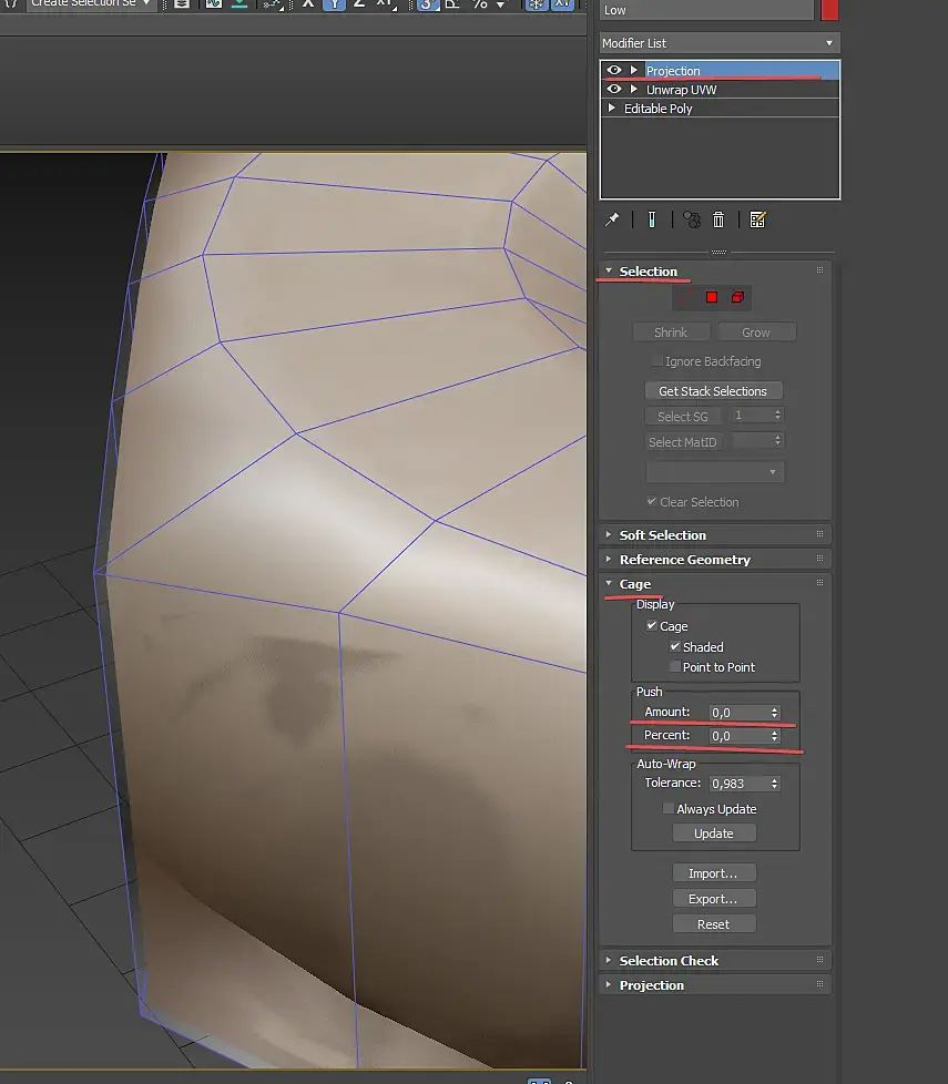 Здесь настройка завершена, однако не стоит закрывать окно, просто отодвиньте его чтобы не мешалось. Теперь выделяем объект Low и видим что появился новый модификатор Projection, открываем в нём свиток Cage, затем включаем чекбокс Shaded (это позволяет видеть границы запекаемого объекта, пересечение с которым приведут к появлению красных зон на будущей текстуре), затем в разделе Percent укажите -100 это позволит вам сбросить Cage до границ низкополигональной модели, а затем, поиграйте со значением Amount - вам потребуется установить такое значение чтобы граница между Low poly и Hi Poly моделью была минимальной, но при этом чтобы не было пересечений, если же подобными махинациями не удаётся достичь требуемого результата можно поработать с Cage на уровне вершин и полигонов выбрав соответствующую иконку в свитке Selection.