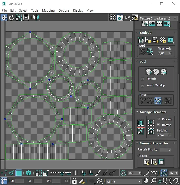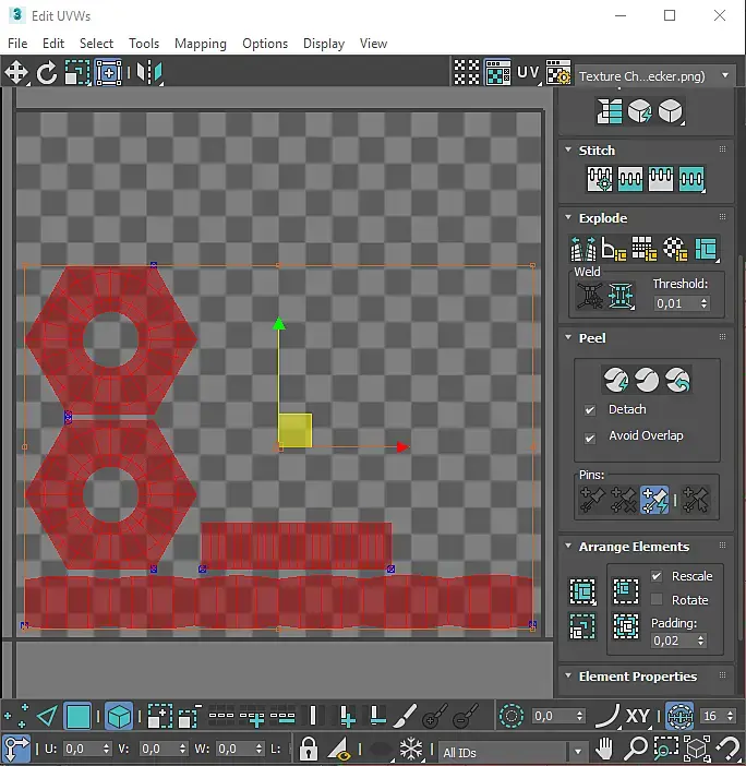 4. Накидываем модификатор Unwrap UWV, выделяем все наши хард эджи, а также 1 грань внутри гайки. После чего нажимаем на Convert Edge Selection to Seams, а после на Quick Peel. Получив развёртку нажмите на кнопку Pack: Custom (подчёркнута на изображении ниже)