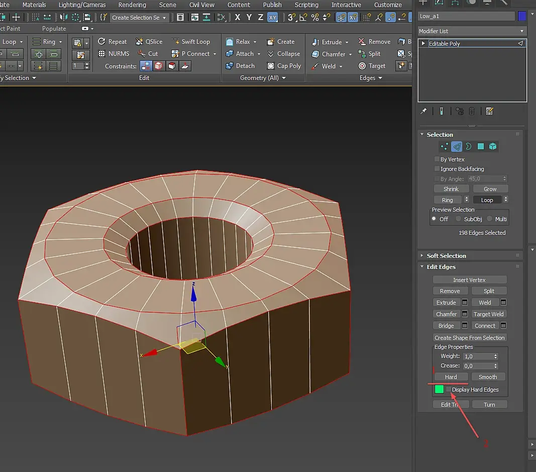 1. Выберите объект Low_a1, нажмите 2 на клавиатуре и выберите все те эджи которые, по вашему мнению, должны быть жёсткими, то есть иметь разные группы сглаживания по разным сторонам эджа. У меня вышло вот так:
