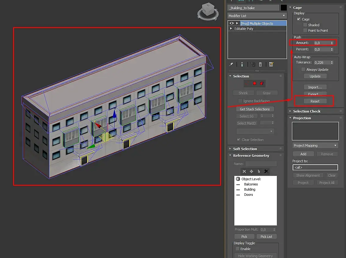 10. Чаще всего оболочка запекания (Cage) по умолчанию кривоватая, поэтому жмем reset и после крутим amount в разделе push (чтобы оболочка проецирования была чуть больше модели(все попоадет в оболочку в направлении объекта проецирования - отпечатается на нем))