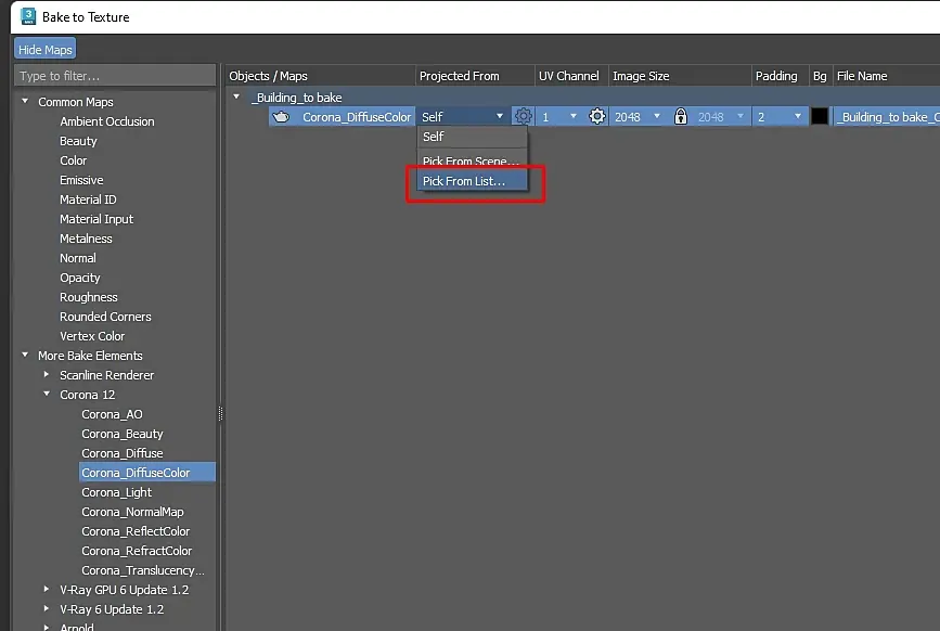 5. Из меню слева выбираем нужный канал для запекания. Важно выбирать именно канал под свой движок (Корона, Арнольд, Вирей и. т.д.) иначе магии не будет.