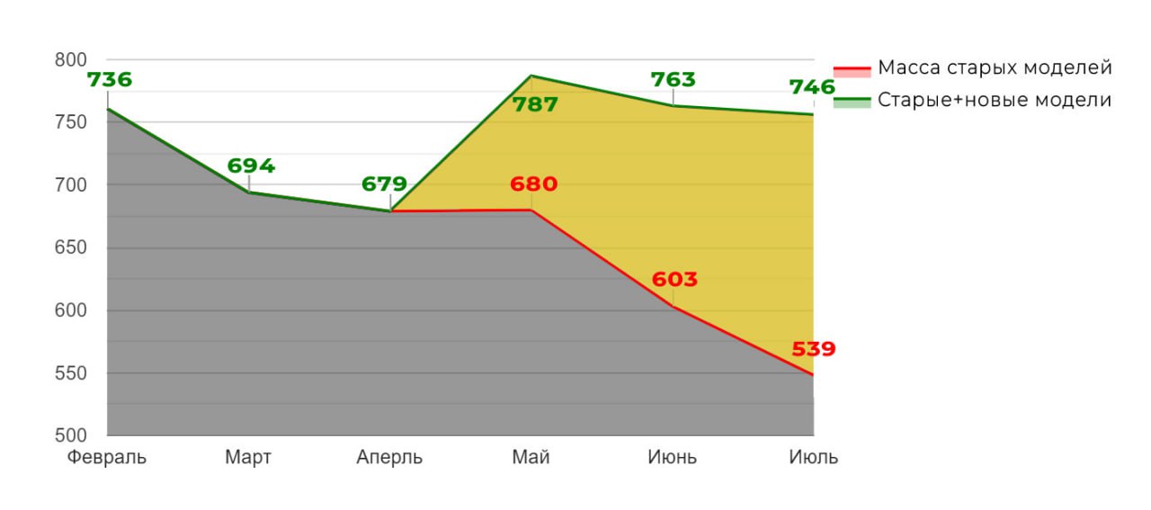 (на графике - зеленая линия - реальные продажи по месяцам, красная линия - посчитала как работала база уже существующих моделей - вычитала из общего количества продаж продажи новых моделей)
