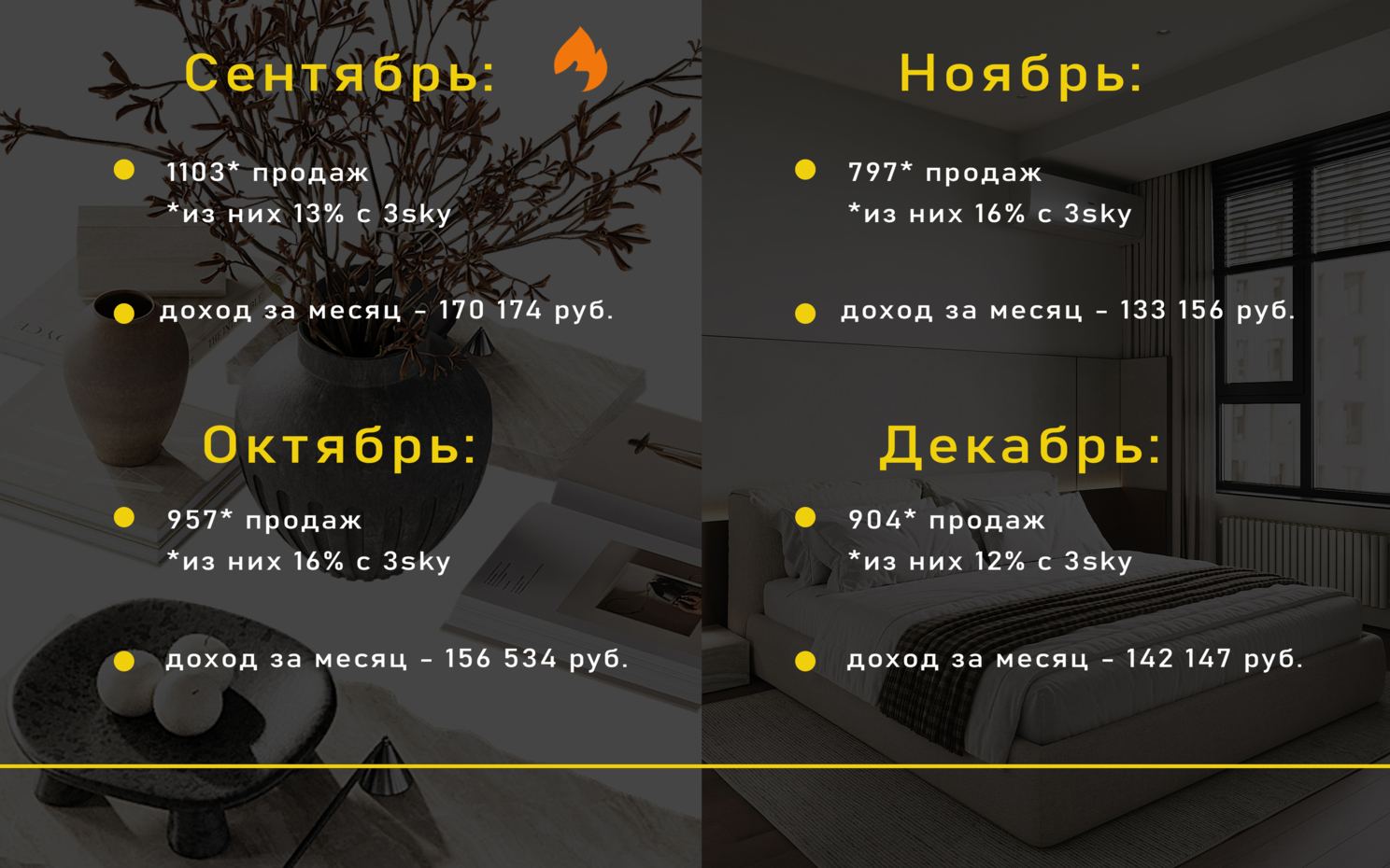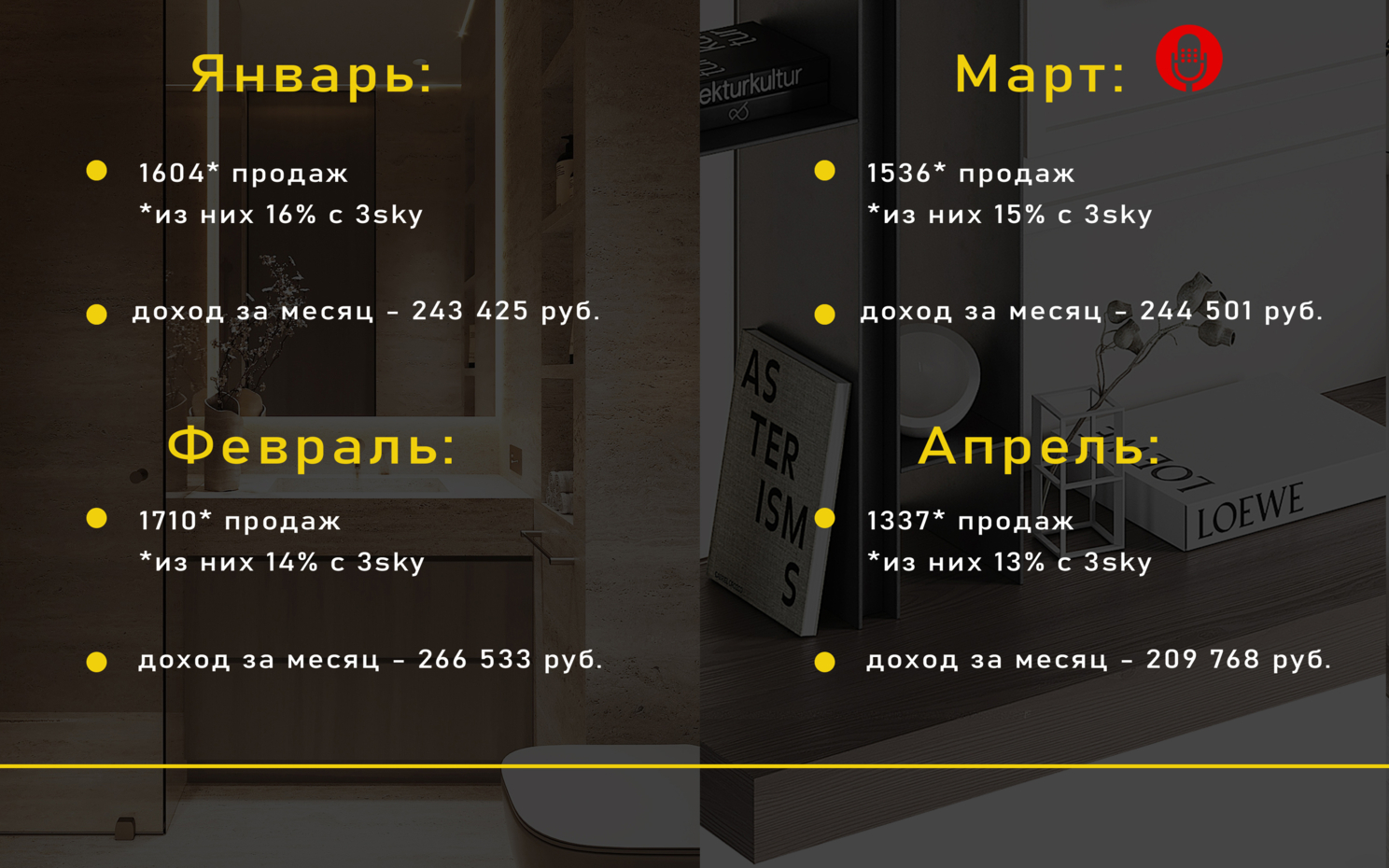 Меня порадовала относительная стабильность дохода с 3ddd+3dsky: то есть нет такого, что у тебя один месяц 200 тыс доход, а в следующий 100 тыс, а наоборот, масса моделей работает стабильно и предсказуемо. Это очень приятно. И это было отличной подушкой в момент, когда все деньги с виза улетали на ремонт.