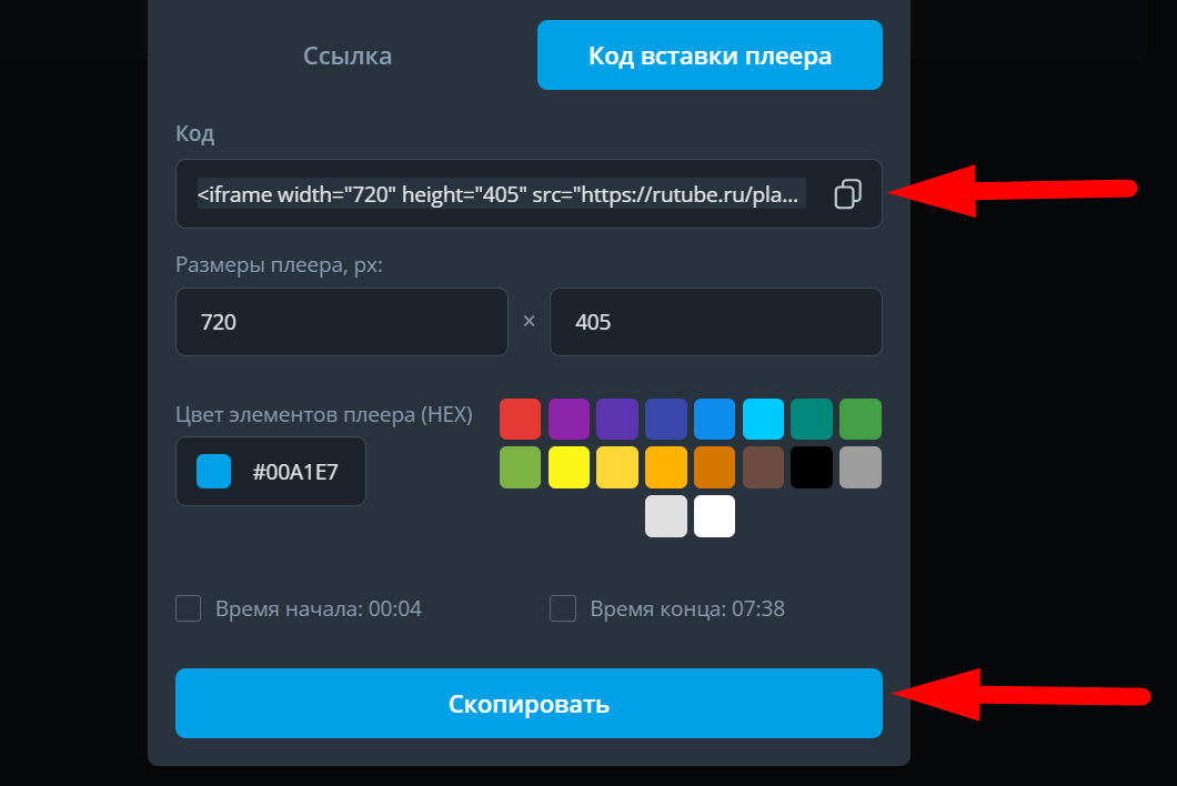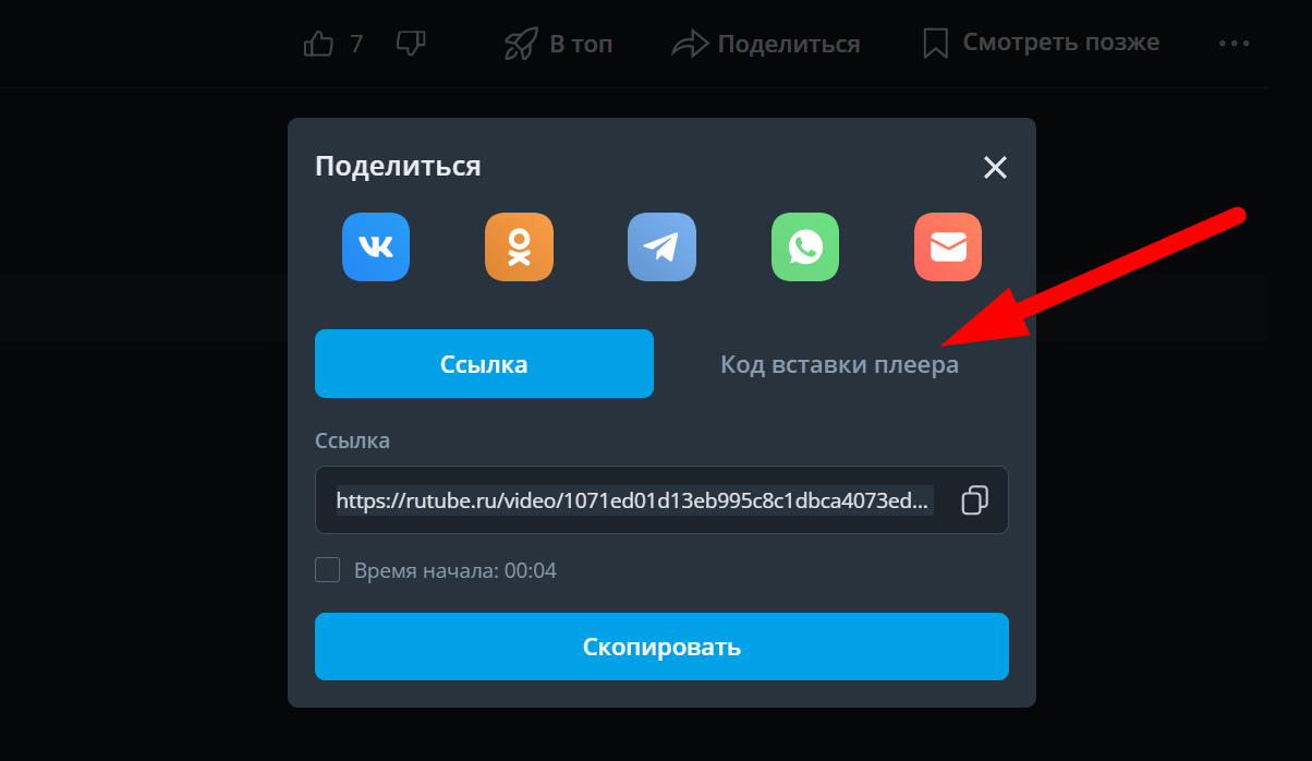 - В открывшемся всплывающем окне нажмите кнопку "Код вставки плеера"