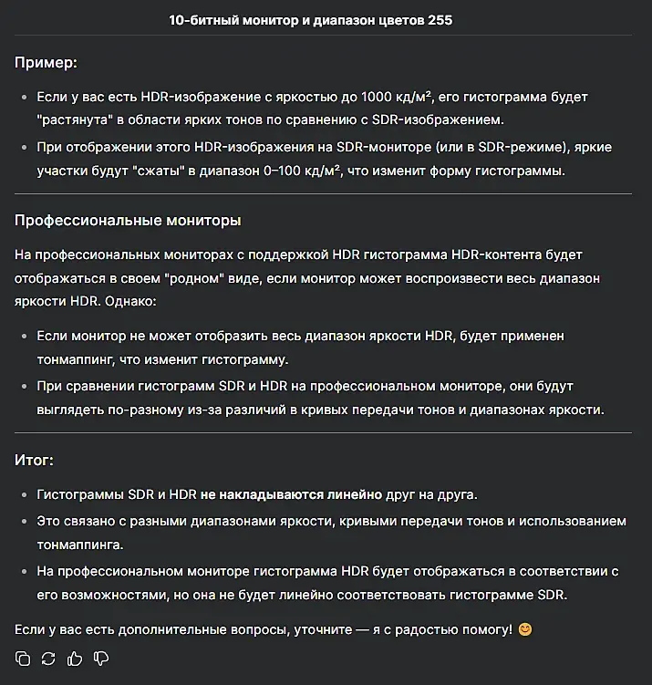 Ещё раз спросил у дипсика и действительно всё не так просто. Тут вмешивается яркость свечения монитора, то есть если 2 моника с яркостью 400 кандел, но разной битности, то они покажут одинаковый белый цвет, то есть 255=1023, но если монитор может показать большую яркость в 500 кандел, то видимо равенства уже не будет. Вообще как я понял гистограммы накладываются друг на друга даже не совсем линейно.