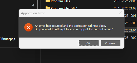Макс выдает ошибку даже при открытии новой сцены . На диске 27 ГБ памяти еще есть . В чем может быть проблема ?