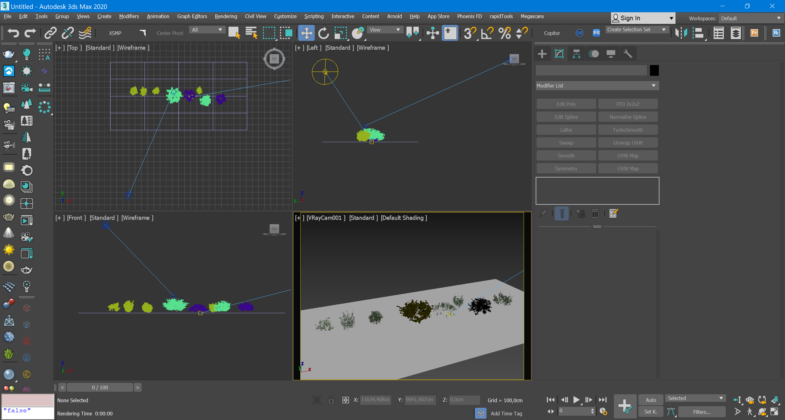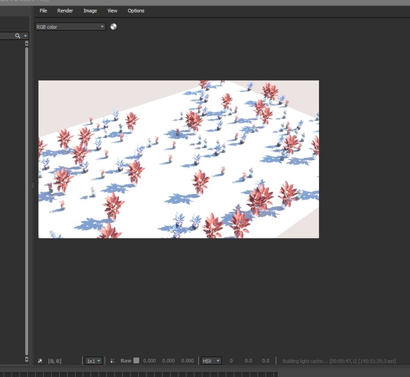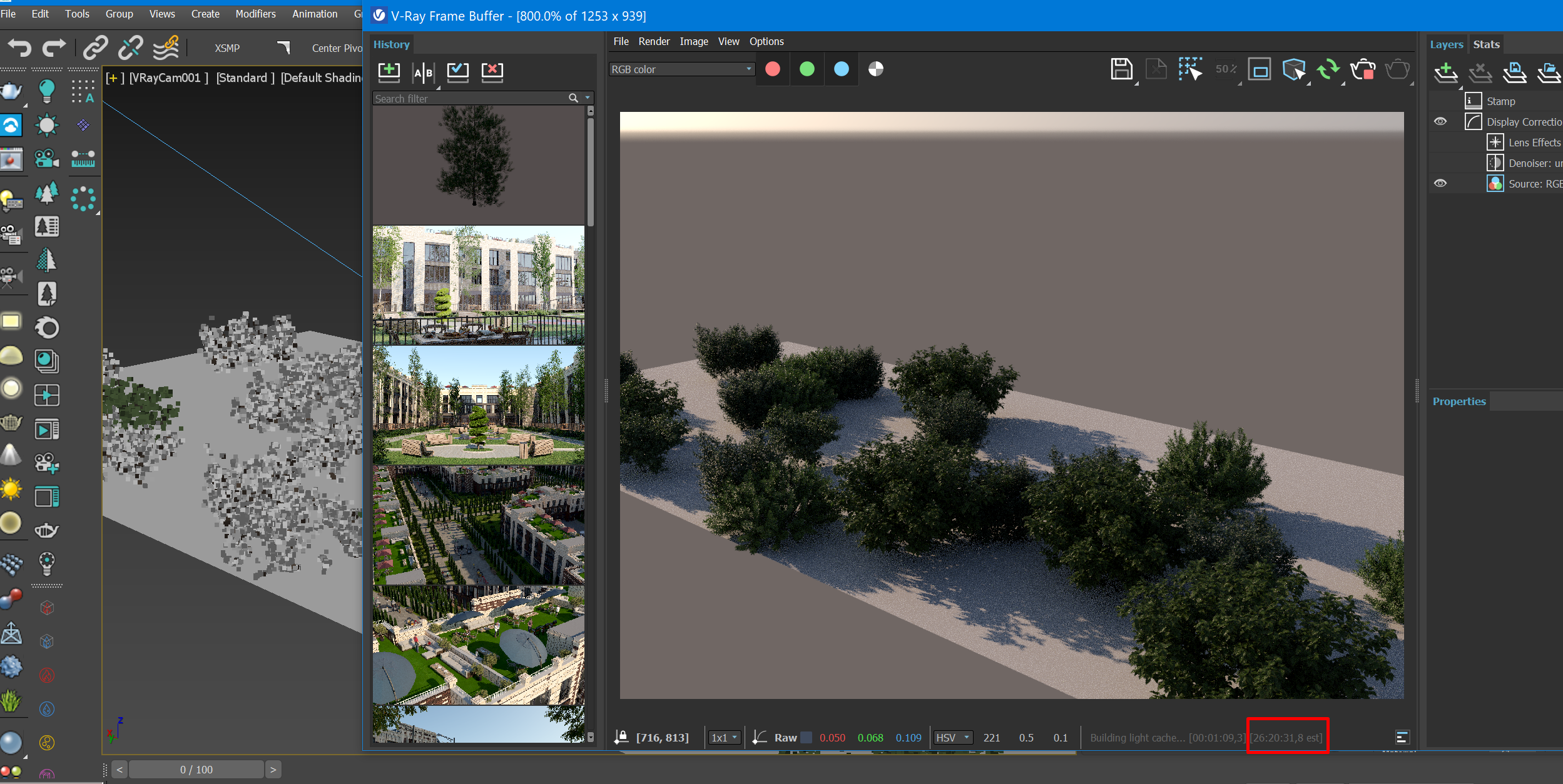 Ааа блин вспомнил. Был косяк у меня как то на котеджном поселке. У фореста был жесткий затуп когда стоит обрезка по сплайну. Он в карту суёт форест колор свой. Вот он ооооочень сильно тупил. У меня предпросчет сцены был минут 20. Не помню правда короной или виреем рендерил