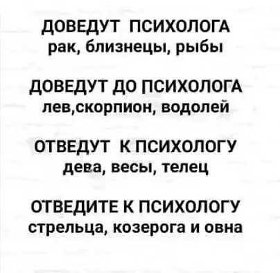 Мы с женой я рыбы и она рак + психолог с красным дипломом.. Жизнь - весела 😂 Довожу психолога....