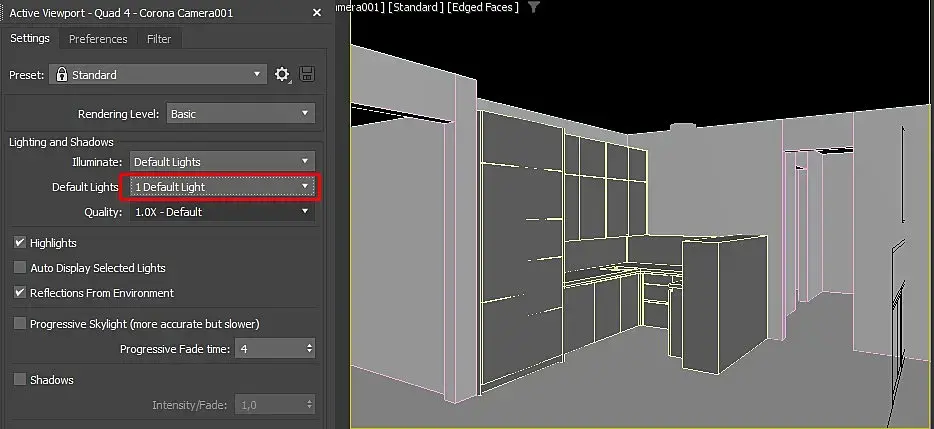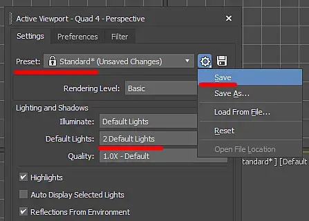 Хм... Может где то в Максе есть .JSON файлы стандартных пресетов. Я открыл блокнотом. Там строчка в сохраняемых пресетах - "Default Light Mode": "2 Default Lights". Вот найти бы их... Чет у меня не вышло.