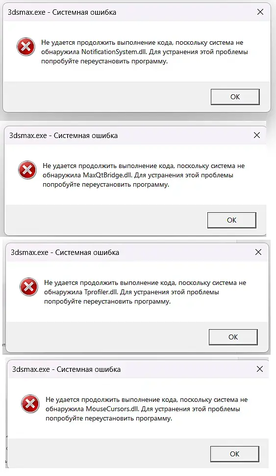Не могу активировать 3d max 2023. При запуске кряка выдает то, что он не видит неких 4 DLL файла (см скрин). Уже сносила и переустанавливала разные пакеты, везде одна и та же ерунда. Подскажите, может кто сталкивался с такой проблемы? Как решить, ума не приложу.
