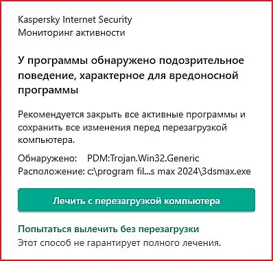 Подскажите если кто сталкивался, второй раз уже за достаточно продолжительное время, первый раз было где-то месяца 2 назад... 3д макс неожиданно закрылся и касперский сразу выдал сообщение о трояне.. я забил, проличил, закинул новый 3dsmax.exe в папку и дальше работать... и вот опять это случилось... не пойму что не так....