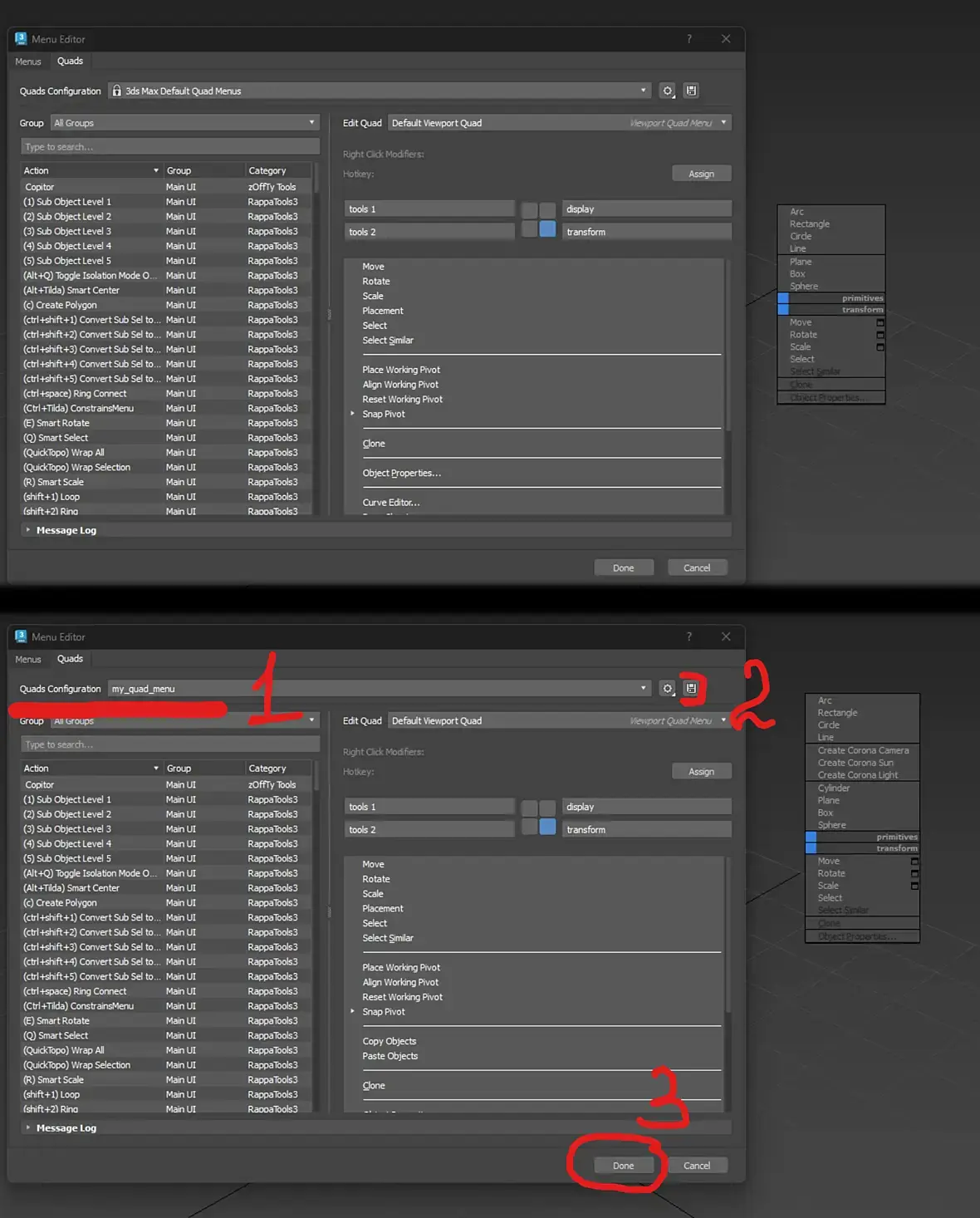 Всем привет. Подскажите, почему-то не сохраняются настройки quad menu , настроил ctrl+пкм под себя, сохранил, всё работает, но стоит перезапустить макс, эта комбинация клавиш открывает стандартное меню, без учёта моих изменений. Мои действия на скрине, выбираю свой созданный профиль, жму дискету , жму Done . Запуск от имени админа и сохранение сцены maxstart.max не помогает. На первом скрине то, как выглядит макс по умолчанию, на втором то, как я хотел бы настроить под себя, но не получается. Мой настроенный профиль в системе есть и с каждым новым запуском, нужно выполнять действия как на скрине 2, а хотелось бы, чтобы он работал по-умолчанию. Кто сталкивался, как решить проблему?