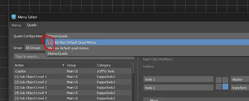 Всем привет. Подскажите, почему-то не сохраняются настройки quad menu , настроил ctrl+пкм под себя, сохранил, всё работает, но стоит перезапустить макс, эта комбинация клавиш открывает стандартное меню, без учёта моих изменений. Мои действия на скрине, выбираю свой созданный профиль, жму дискету , жму Done . Запуск от имени админа и сохранение сцены maxstart.max не помогает. На первом скрине то, как выглядит макс по умолчанию, на втором то, как я хотел бы настроить под себя, но не получается. Мой настроенный профиль в системе есть и с каждым новым запуском, нужно выполнять действия как на скрине 2, а хотелось бы, чтобы он работал по-умолчанию. Кто сталкивался, как решить проблему?