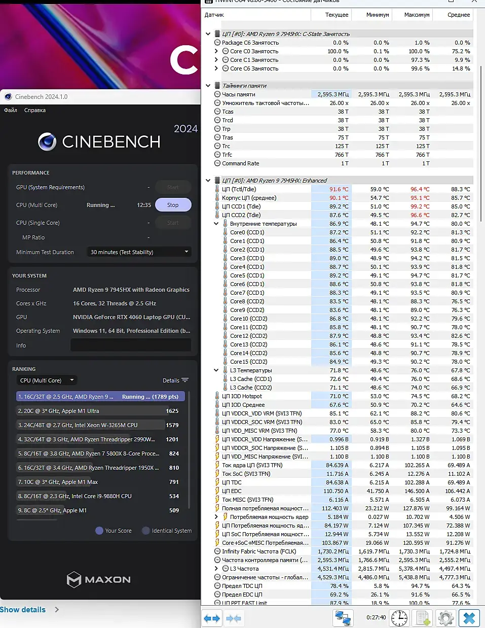При рендере на максимальном режиме производительности ноут стал долбится в 96 градусов, при частоте по всем ядрам 3,8-3,9, и хавая всего 65 ватт. При ограничении температуры на 85 - частота вообще падала до 3,1-3,2ггц в многопотоке.