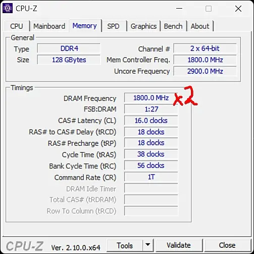 Как я уже говорил. Можете просто запустить Aida64 Cache Mem бенчмарк и ужаснуться результатам. Вангую там будет 60ПСП и 100ns Latency Ну и можете открыть диспетчер задач если у вас свежая винда и там будет указана скорость памяти. Ну или в CPU-Z (в CPU-Z указывается уполовиненная частота). В общем, вот... Теперь вы знаете, удачи вам с этим разобраться )))