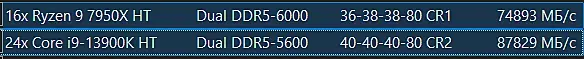 v01ce, дело и не в памяти и не в плате. Просто у Интела IMC на несколько ступеней выше частоту берет чем АМД. Где для АМД непреодолимая планка в 5600Mhz там у Интела 6000Mhz. Ну и еще частоты памяти у АМД и Интела нельзя лоб в лоб сравнивать. При равной частоте у Интела на ~20% выше ПСП и немного ниже Latency.
