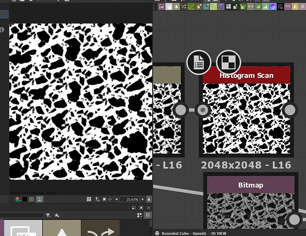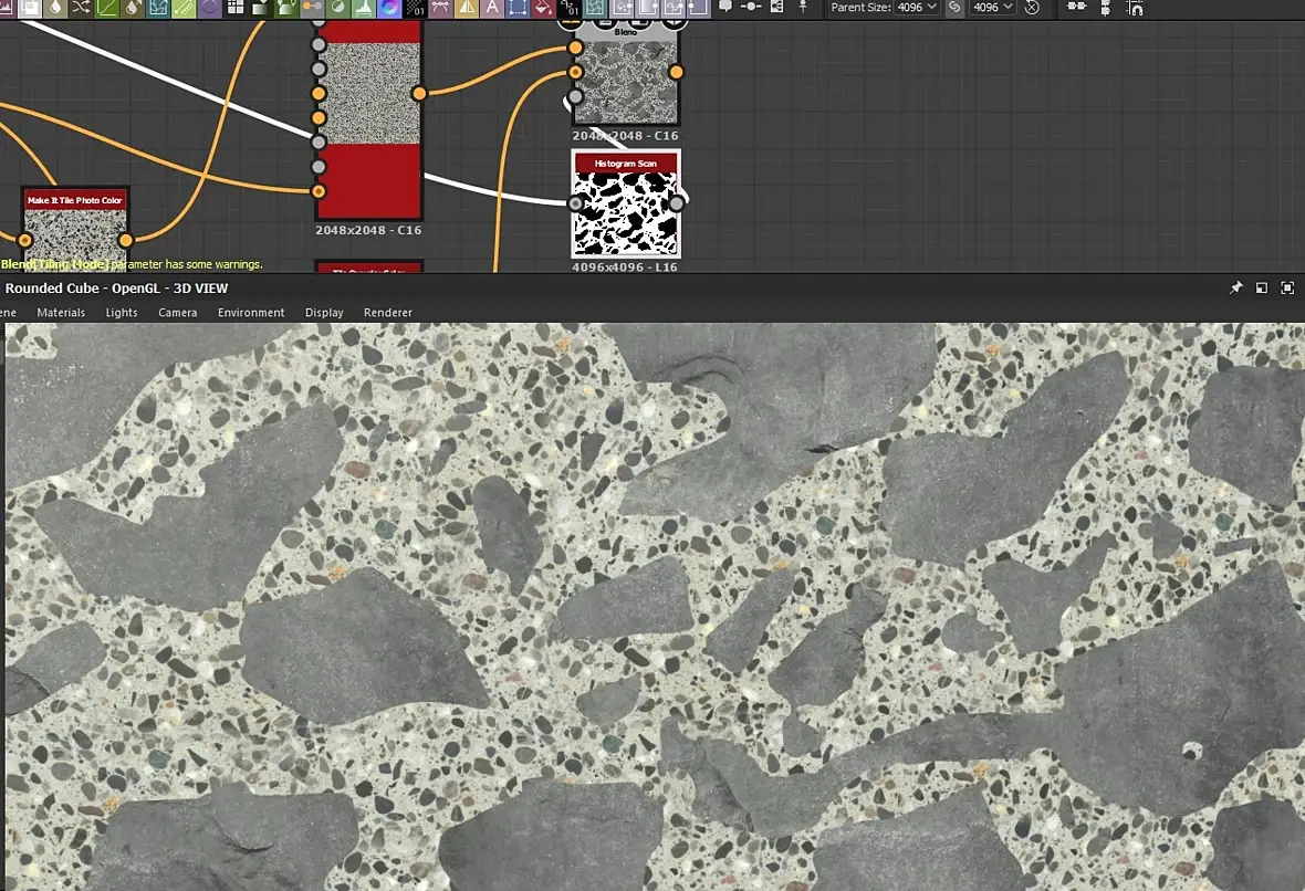 GorillaZ, Это что то типа терраццо должно получится? В голову тоже ничего не приходит, Кроме как найти похожее с крупными кусками пропустить через Pix Plant для бесшовности, а потом через Histogram Scan в SD для маски и потом ужа 2 мата.