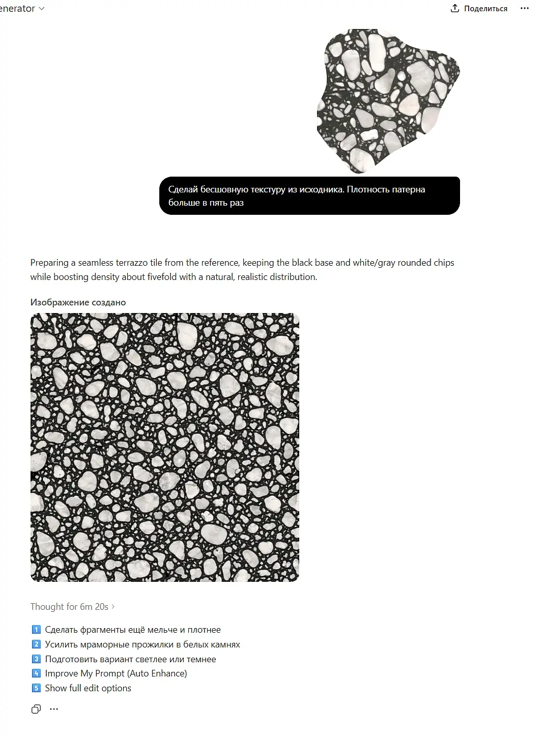 По поводу роликов не понял. Мне сидеть и ждать чтоб меня лично кто-то попросил ролик записать? я могу это сделать, но не бесплатно. Что написано выше это полная шляпа, это не промт. Мне помнится тема тераццо вроде уже подымалась. Скажу так, я потратил наверно час, может больше на тесты. Потом меня затянуло, я сделал материал. Причем получилось сделать бесшовной текстуру, на удивление в Банане. Немного ручной доводки. Потом материал сделал. Рендер и т.д. Я потратил несколько часов своего рабочего времени. Знаешь, я бесплатно не хочу это выкладывать. Материал лежит в библиотеке сайта, можно купить.
