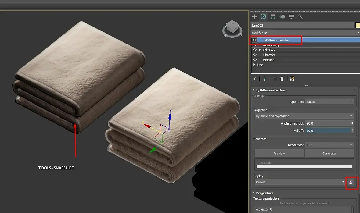 Сохраняем результат typrojection как текстуру. Снимаем с изначального объекта snapshot'ом сетку, применяем текстуру к любому удобному материалу.