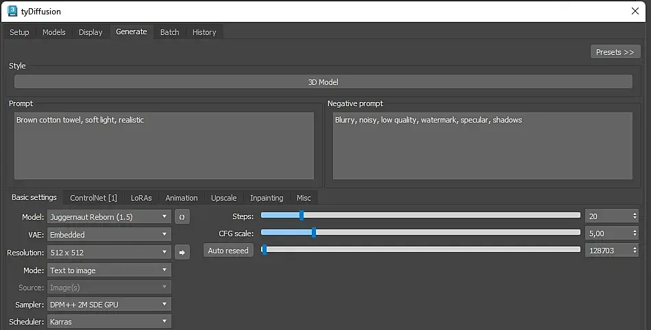 Присоединяюсь к вопросу.Скачал,установил.По дефолту предлагают сделать кошку,я нашел у себя 3д модель кошки без текстур в сермате,рендернул,получилось вполне ничего,при помощи ty diffusion texture gen на модельку спроецировалась текстура кошки.А дальше что делать с этим не понятно.